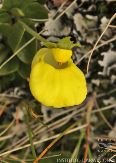 Hierba pigmea, perenne, con rizomas delgados horizontales u oblicuos, de los que nacen tallos aéreos muy breves o casi nulos. Hojas arrosetadas, opuestas, oblanceolado- u obovado- espatuladas, de 0,7-2,5 × 0,4-1,1 cm, obtusas o semiagudas en el ápice, pubescentes en ambas caras, atenuadas en la base en pseudopecíolo lineal de 3-18 mm de largo. Flores solitarias en los extremos de los tallos, con pedúnculos largos y pubescentes de 1,8-4,5 cm de largo; segmentos del cáliz ovados, subagudos, de 3-5,5 × 2-3,5 mm, glanduloso-pubescentes, el margen ciliolado; corola de color amarillo intenso, glanduloso-pubérula, con labio superior cuculado, triangular, densamente glandular de 2-3 × 3- 5 mm; labio inferior subcircular a obovado, deprimido dorsiventralmente de 10-16 × 7-13 mm, con algunos pelos eglandulares en el ángulo interlabial; apéndice prácticamente recto no plegado al interior del labio inferior; elaióforo con glándulas por lo general reunidas en una zona de contorno oblongo cubriendo la parte distal del apéndice; estambres con filamentos cortos de 1-1,5 mm de largo, con pelos glandulares esparcidos; anteras con tecas divergentes de color pardo claro; ovario ovoide, de 1,2 × 2 mm, glanduloso; estilo de 1,2-1,5 mm de largo, sobrepasando a los estambres, curvado levemente hacia abajo. Cápsula piriforme, rugosa y glandulosa, de 5,5 mm de largo. Semillas elipsoides, de 0,5 × 0,3 mm, rojizas, con costillas longitudinales.