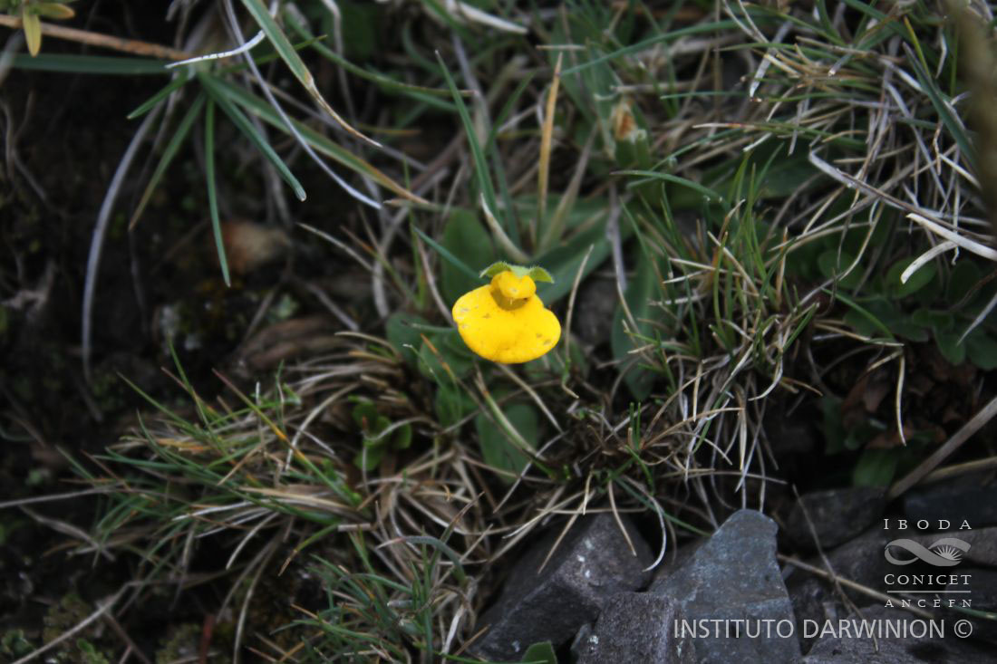 Hierba pigmea, perenne, con rizomas delgados horizontales u oblicuos, de los que nacen tallos aéreos muy breves o casi nulos. Hojas arrosetadas, opuestas, oblanceolado- u obovado- espatuladas, de 0,7-2,5 × 0,4-1,1 cm, obtusas o semiagudas en el ápice, pubescentes en ambas caras, atenuadas en la base en pseudopecíolo lineal de 3-18 mm de largo. Flores solitarias en los extremos de los tallos, con pedúnculos largos y pubescentes de 1,8-4,5 cm de largo; segmentos del cáliz ovados, subagudos, de 3-5,5 × 2-3,5 mm, glanduloso-pubescentes, el margen ciliolado; corola de color amarillo intenso, glanduloso-pubérula, con labio superior cuculado, triangular, densamente glandular de 2-3 × 3- 5 mm; labio inferior subcircular a obovado, deprimido dorsiventralmente de 10-16 × 7-13 mm, con algunos pelos eglandulares en el ángulo interlabial; apéndice prácticamente recto no plegado al interior del labio inferior; elaióforo con glándulas por lo general reunidas en una zona de contorno oblongo cubriendo la parte distal del apéndice; estambres con filamentos cortos de 1-1,5 mm de largo, con pelos glandulares esparcidos; anteras con tecas divergentes de color pardo claro; ovario ovoide, de 1,2 × 2 mm, glanduloso; estilo de 1,2-1,5 mm de largo, sobrepasando a los estambres, curvado levemente hacia abajo. Cápsula piriforme, rugosa y glandulosa, de 5,5 mm de largo. Semillas elipsoides, de 0,5 × 0,3 mm, rojizas, con costillas longitudinales.