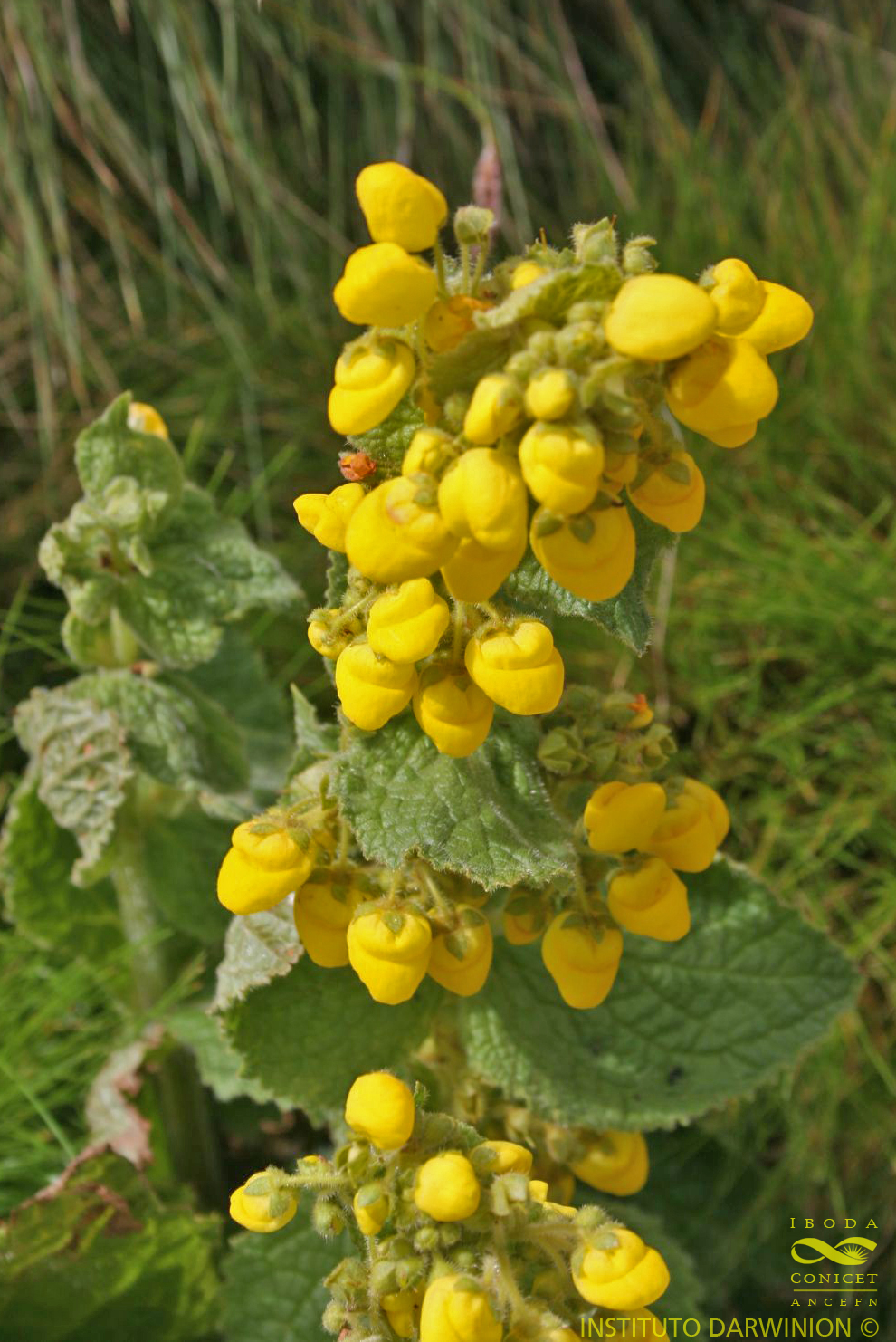 Hierba ascendente o erecta, hasta de 50-70 cm de alto, con tallos semi cuadrangulares, más o menos densamente glanduloso-pubescentes, con entrenudos de 20-60 mm de largo. Hojas ovado-cordadas de 7-20 × 2,4-11 cm, herbáceas, obtusas a agudas, atenuadas o cuneadas en la base; margen marcadamente doble aserrado; cara adaxial marcadamente rugosa con pelos glandulares cortos y glándulas sésiles color pardo; cara abaxial con notables nervaduras pinnadas, de color verde pálido, nervaduras pilosas a hirsutas, resto de la lámina glabro o con pelos glandulares; las hojas superiores y medianas sésiles, las inferiores más o menos contraídas en su base en forma de pecíolo plano, alado hasta de 8 cm de largo. Inflorescencias con 1-3 cimas de 8-20 flores; pedicelos delgados, pubescentes, de 5-22 mm de largo. Sépalos ovados, agudos, de unos 4 mm de largo, densamente glanduloso- pubescentes en la cara adaxial, glandulosos en la cara abaxial; corola amarilla, con labio superior sacciforme de 4-8 × 5-10 mm; labio inferior sacciforme de 8-15 × 6-11 mm; labio superior cubriendo completamente la entrada, la garganta es muy corta y el apéndice apenas se pliega en el interior del labio inferior; elaióforo denso, tan ancho como el labio inferior, se dispone en forma de una banda cubriendo todo el apéndice; filamentos estaminales muy largos, de 3-5,2 mm de largo y anteras pardas con tecas iguales entre sí, orientadas hacia arriba; los estambres y el estilo se apoyan sobre una depresión del labio inferior y son completamente cubiertos por el superior; ovario glanduloso de unos 2 mm de largo. Cápsula ovoide de 5-8 mm de largo, con superficie rugosa y glandular. Semillas elipsoides, de alrededor de 1 mm de largo, rojizas, con estrías longitudinales y transversales.