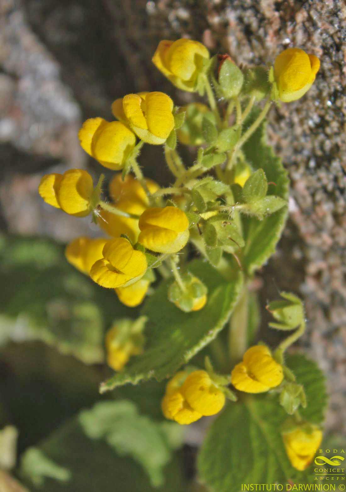 Hierba ascendente o erecta, hasta de 50-70 cm de alto, con tallos semi cuadrangulares, más o menos densamente glanduloso-pubescentes, con entrenudos de 20-60 mm de largo. Hojas ovado-cordadas de 7-20 × 2,4-11 cm, herbáceas, obtusas a agudas, atenuadas o cuneadas en la base; margen marcadamente doble aserrado; cara adaxial marcadamente rugosa con pelos glandulares cortos y glándulas sésiles color pardo; cara abaxial con notables nervaduras pinnadas, de color verde pálido, nervaduras pilosas a hirsutas, resto de la lámina glabro o con pelos glandulares; las hojas superiores y medianas sésiles, las inferiores más o menos contraídas en su base en forma de pecíolo plano, alado hasta de 8 cm de largo. Inflorescencias con 1-3 cimas de 8-20 flores; pedicelos delgados, pubescentes, de 5-22 mm de largo. Sépalos ovados, agudos, de unos 4 mm de largo, densamente glanduloso- pubescentes en la cara adaxial, glandulosos en la cara abaxial; corola amarilla, con labio superior sacciforme de 4-8 × 5-10 mm; labio inferior sacciforme de 8-15 × 6-11 mm; labio superior cubriendo completamente la entrada, la garganta es muy corta y el apéndice apenas se pliega en el interior del labio inferior; elaióforo denso, tan ancho como el labio inferior, se dispone en forma de una banda cubriendo todo el apéndice; filamentos estaminales muy largos, de 3-5,2 mm de largo y anteras pardas con tecas iguales entre sí, orientadas hacia arriba; los estambres y el estilo se apoyan sobre una depresión del labio inferior y son completamente cubiertos por el superior; ovario glanduloso de unos 2 mm de largo. Cápsula ovoide de 5-8 mm de largo, con superficie rugosa y glandular. Semillas elipsoides, de alrededor de 1 mm de largo, rojizas, con estrías longitudinales y transversales.