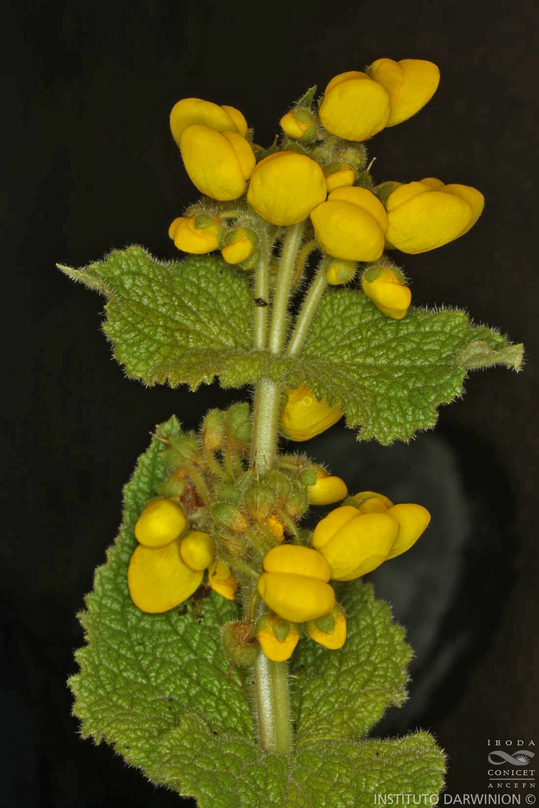 Hierba ascendente o erecta, hasta de 50-70 cm de alto, con tallos semi cuadrangulares, más o menos densamente glanduloso-pubescentes, con entrenudos de 20-60 mm de largo. Hojas ovado-cordadas de 7-20 × 2,4-11 cm, herbáceas, obtusas a agudas, atenuadas o cuneadas en la base; margen marcadamente doble aserrado; cara adaxial marcadamente rugosa con pelos glandulares cortos y glándulas sésiles color pardo; cara abaxial con notables nervaduras pinnadas, de color verde pálido, nervaduras pilosas a hirsutas, resto de la lámina glabro o con pelos glandulares; las hojas superiores y medianas sésiles, las inferiores más o menos contraídas en su base en forma de pecíolo plano, alado hasta de 8 cm de largo. Inflorescencias con 1-3 cimas de 8-20 flores; pedicelos delgados, pubescentes, de 5-22 mm de largo. Sépalos ovados, agudos, de unos 4 mm de largo, densamente glanduloso- pubescentes en la cara adaxial, glandulosos en la cara abaxial; corola amarilla, con labio superior sacciforme de 4-8 × 5-10 mm; labio inferior sacciforme de 8-15 × 6-11 mm; labio superior cubriendo completamente la entrada, la garganta es muy corta y el apéndice apenas se pliega en el interior del labio inferior; elaióforo denso, tan ancho como el labio inferior, se dispone en forma de una banda cubriendo todo el apéndice; filamentos estaminales muy largos, de 3-5,2 mm de largo y anteras pardas con tecas iguales entre sí, orientadas hacia arriba; los estambres y el estilo se apoyan sobre una depresión del labio inferior y son completamente cubiertos por el superior; ovario glanduloso de unos 2 mm de largo. Cápsula ovoide de 5-8 mm de largo, con superficie rugosa y glandular. Semillas elipsoides, de alrededor de 1 mm de largo, rojizas, con estrías longitudinales y transversales.
