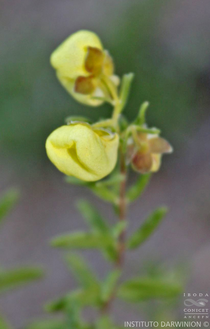 Arbusto erecto o ascendente de 0,1 a 0,8 m de alto, en general pubérulo o cortamente villoso con pelos blancos. Hojas lanceoladas de 1,3-4,6 × 0,4-2,4 cm, herbáceas, agudas en el ápice, cuneadas o redondeadas en la base; superficie adaxial verde fuerte a verde grisácea, laxamente pubérula a cortamente villosa; cara abaxial verde pálida, reticulado venosa con las nervaduras principales estrigosas o pubérulas, espacios intermedios glabros o pubérulos con pelos glandulares amarillentos; margen foliar fuertemente serrado a doblemente aserrado, con 8- 18 dientes a cada lado de la hoja; pecíolos de 2-6 mm de largo, villosos. Inflorescencia cimosa con 1-4 pares de cimas bracteosas que llevan 1-4 flores. Sépalos amarillo-verdoso pálidos, ovados, anchos de 4-6,7 × 3-6 mm, agudos; cara abaxial glandular y villosa y la adaxial pubérula; corola amarillo limón pálido; labio superior cuculado de 2-3 × 5-7 mm; labio inferior sacciforme mucho mayor de 15-20 × 6-12 mm, geniculado, de modo que oculta completamente al labio superior y la garganta, ésta es tan larga como la porción globosa; la garganta es casi blanca; filamentos de los estambres de 0,8-1,6 mm de largo, tecas divaricadas de color castaño; ovario semiínfero, pubérulo- glandular. Cápsula ovoide, acuminada, de 5-8 mm de largo, pubérula-glandular a glabra, cubierta por el cáliz, que es acrescente. Semillas de contorno oblongo, de 0,5 mm de largo, agudas en los extremos.