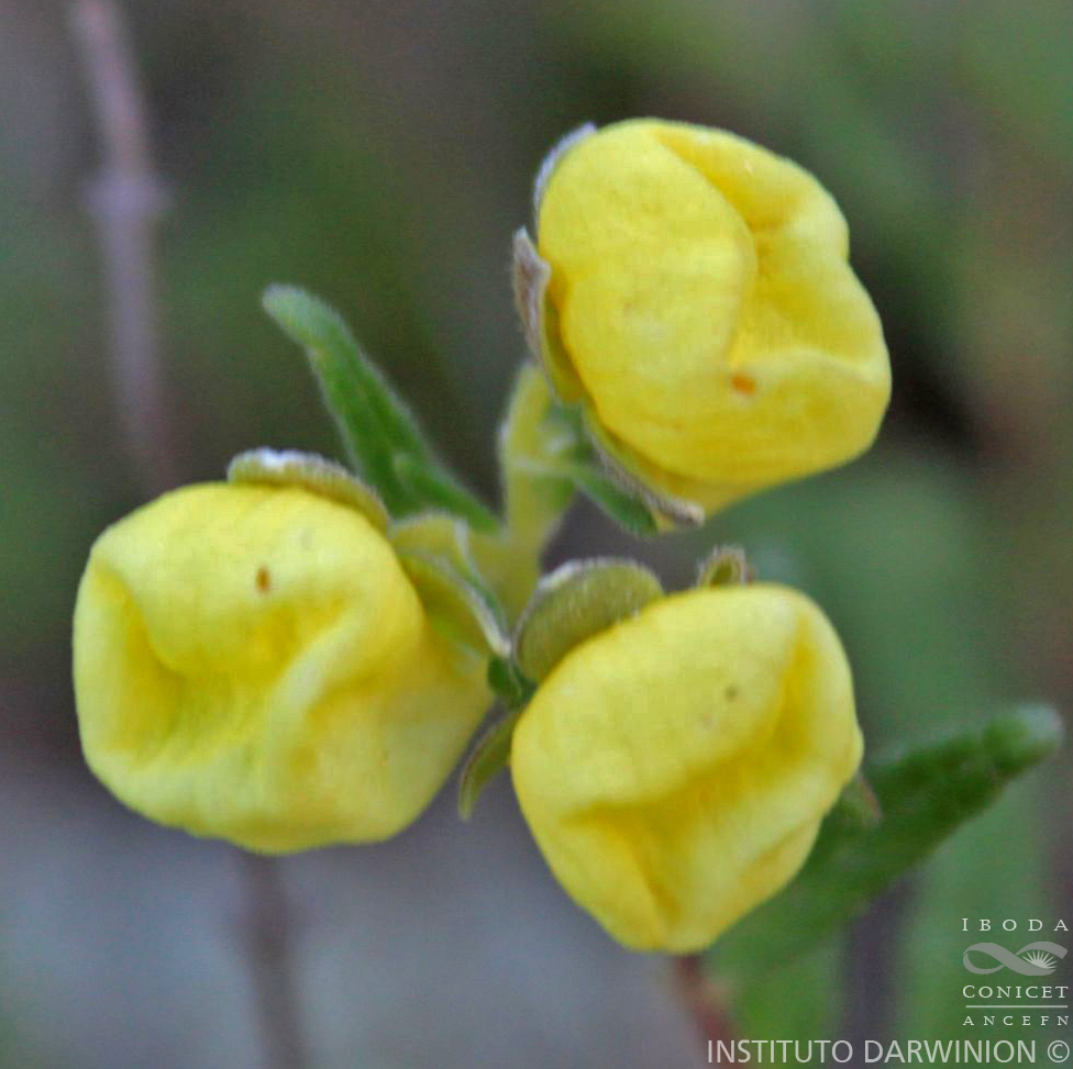 Arbusto erecto o ascendente de 0,1 a 0,8 m de alto, en general pubérulo o cortamente villoso con pelos blancos. Hojas lanceoladas de 1,3-4,6 × 0,4-2,4 cm, herbáceas, agudas en el ápice, cuneadas o redondeadas en la base; superficie adaxial verde fuerte a verde grisácea, laxamente pubérula a cortamente villosa; cara abaxial verde pálida, reticulado venosa con las nervaduras principales estrigosas o pubérulas, espacios intermedios glabros o pubérulos con pelos glandulares amarillentos; margen foliar fuertemente serrado a doblemente aserrado, con 8- 18 dientes a cada lado de la hoja; pecíolos de 2-6 mm de largo, villosos. Inflorescencia cimosa con 1-4 pares de cimas bracteosas que llevan 1-4 flores. Sépalos amarillo-verdoso pálidos, ovados, anchos de 4-6,7 × 3-6 mm, agudos; cara abaxial glandular y villosa y la adaxial pubérula; corola amarillo limón pálido; labio superior cuculado de 2-3 × 5-7 mm; labio inferior sacciforme mucho mayor de 15-20 × 6-12 mm, geniculado, de modo que oculta completamente al labio superior y la garganta, ésta es tan larga como la porción globosa; la garganta es casi blanca; filamentos de los estambres de 0,8-1,6 mm de largo, tecas divaricadas de color castaño; ovario semiínfero, pubérulo- glandular. Cápsula ovoide, acuminada, de 5-8 mm de largo, pubérula-glandular a glabra, cubierta por el cáliz, que es acrescente. Semillas de contorno oblongo, de 0,5 mm de largo, agudas en los extremos.
