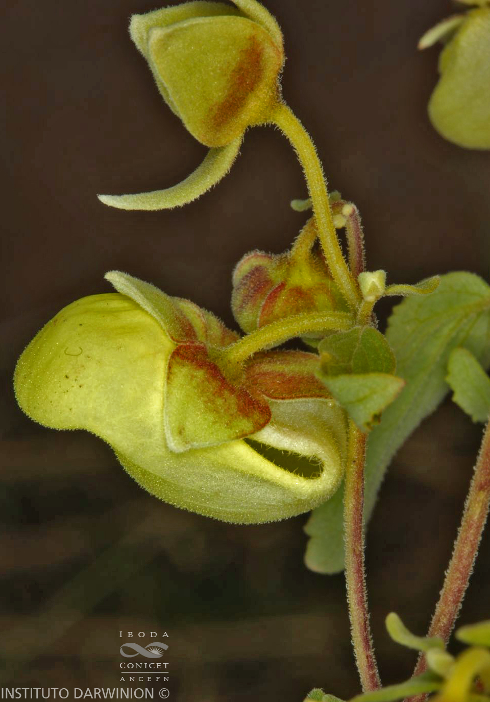 Arbusto erecto o ascendente de 0,1 a 0,8 m de alto, en general pubérulo o cortamente villoso con pelos blancos. Hojas lanceoladas de 1,3-4,6 × 0,4-2,4 cm, herbáceas, agudas en el ápice, cuneadas o redondeadas en la base; superficie adaxial verde fuerte a verde grisácea, laxamente pubérula a cortamente villosa; cara abaxial verde pálida, reticulado venosa con las nervaduras principales estrigosas o pubérulas, espacios intermedios glabros o pubérulos con pelos glandulares amarillentos; margen foliar fuertemente serrado a doblemente aserrado, con 8- 18 dientes a cada lado de la hoja; pecíolos de 2-6 mm de largo, villosos. Inflorescencia cimosa con 1-4 pares de cimas bracteosas que llevan 1-4 flores. Sépalos amarillo-verdoso pálidos, ovados, anchos de 4-6,7 × 3-6 mm, agudos; cara abaxial glandular y villosa y la adaxial pubérula; corola amarillo limón pálido; labio superior cuculado de 2-3 × 5-7 mm; labio inferior sacciforme mucho mayor de 15-20 × 6-12 mm, geniculado, de modo que oculta completamente al labio superior y la garganta, ésta es tan larga como la porción globosa; la garganta es casi blanca; filamentos de los estambres de 0,8-1,6 mm de largo, tecas divaricadas de color castaño; ovario semiínfero, pubérulo- glandular. Cápsula ovoide, acuminada, de 5-8 mm de largo, pubérula-glandular a glabra, cubierta por el cáliz, que es acrescente. Semillas de contorno oblongo, de 0,5 mm de largo, agudas en los extremos.