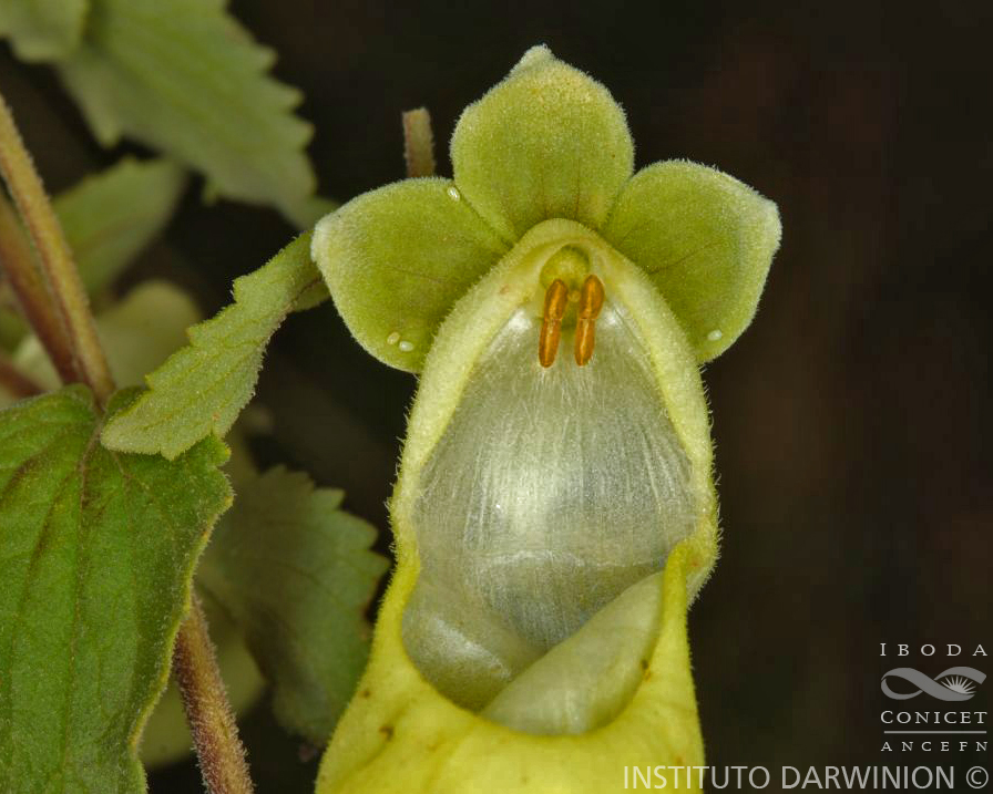 Arbusto erecto o ascendente de 0,1 a 0,8 m de alto, en general pubérulo o cortamente villoso con pelos blancos. Hojas lanceoladas de 1,3-4,6 × 0,4-2,4 cm, herbáceas, agudas en el ápice, cuneadas o redondeadas en la base; superficie adaxial verde fuerte a verde grisácea, laxamente pubérula a cortamente villosa; cara abaxial verde pálida, reticulado venosa con las nervaduras principales estrigosas o pubérulas, espacios intermedios glabros o pubérulos con pelos glandulares amarillentos; margen foliar fuertemente serrado a doblemente aserrado, con 8- 18 dientes a cada lado de la hoja; pecíolos de 2-6 mm de largo, villosos. Inflorescencia cimosa con 1-4 pares de cimas bracteosas que llevan 1-4 flores. Sépalos amarillo-verdoso pálidos, ovados, anchos de 4-6,7 × 3-6 mm, agudos; cara abaxial glandular y villosa y la adaxial pubérula; corola amarillo limón pálido; labio superior cuculado de 2-3 × 5-7 mm; labio inferior sacciforme mucho mayor de 15-20 × 6-12 mm, geniculado, de modo que oculta completamente al labio superior y la garganta, ésta es tan larga como la porción globosa; la garganta es casi blanca; filamentos de los estambres de 0,8-1,6 mm de largo, tecas divaricadas de color castaño; ovario semiínfero, pubérulo- glandular. Cápsula ovoide, acuminada, de 5-8 mm de largo, pubérula-glandular a glabra, cubierta por el cáliz, que es acrescente. Semillas de contorno oblongo, de 0,5 mm de largo, agudas en los extremos.