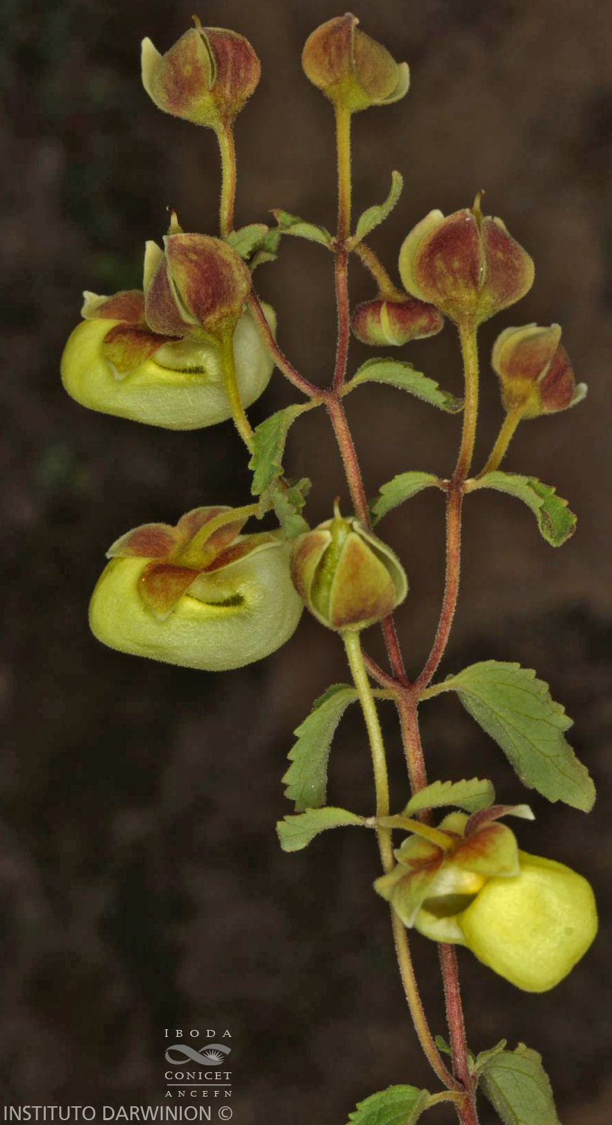 Arbusto erecto o ascendente de 0,1 a 0,8 m de alto, en general pubérulo o cortamente villoso con pelos blancos. Hojas lanceoladas de 1,3-4,6 × 0,4-2,4 cm, herbáceas, agudas en el ápice, cuneadas o redondeadas en la base; superficie adaxial verde fuerte a verde grisácea, laxamente pubérula a cortamente villosa; cara abaxial verde pálida, reticulado venosa con las nervaduras principales estrigosas o pubérulas, espacios intermedios glabros o pubérulos con pelos glandulares amarillentos; margen foliar fuertemente serrado a doblemente aserrado, con 8- 18 dientes a cada lado de la hoja; pecíolos de 2-6 mm de largo, villosos. Inflorescencia cimosa con 1-4 pares de cimas bracteosas que llevan 1-4 flores. Sépalos amarillo-verdoso pálidos, ovados, anchos de 4-6,7 × 3-6 mm, agudos; cara abaxial glandular y villosa y la adaxial pubérula; corola amarillo limón pálido; labio superior cuculado de 2-3 × 5-7 mm; labio inferior sacciforme mucho mayor de 15-20 × 6-12 mm, geniculado, de modo que oculta completamente al labio superior y la garganta, ésta es tan larga como la porción globosa; la garganta es casi blanca; filamentos de los estambres de 0,8-1,6 mm de largo, tecas divaricadas de color castaño; ovario semiínfero, pubérulo- glandular. Cápsula ovoide, acuminada, de 5-8 mm de largo, pubérula-glandular a glabra, cubierta por el cáliz, que es acrescente. Semillas de contorno oblongo, de 0,5 mm de largo, agudas en los extremos.