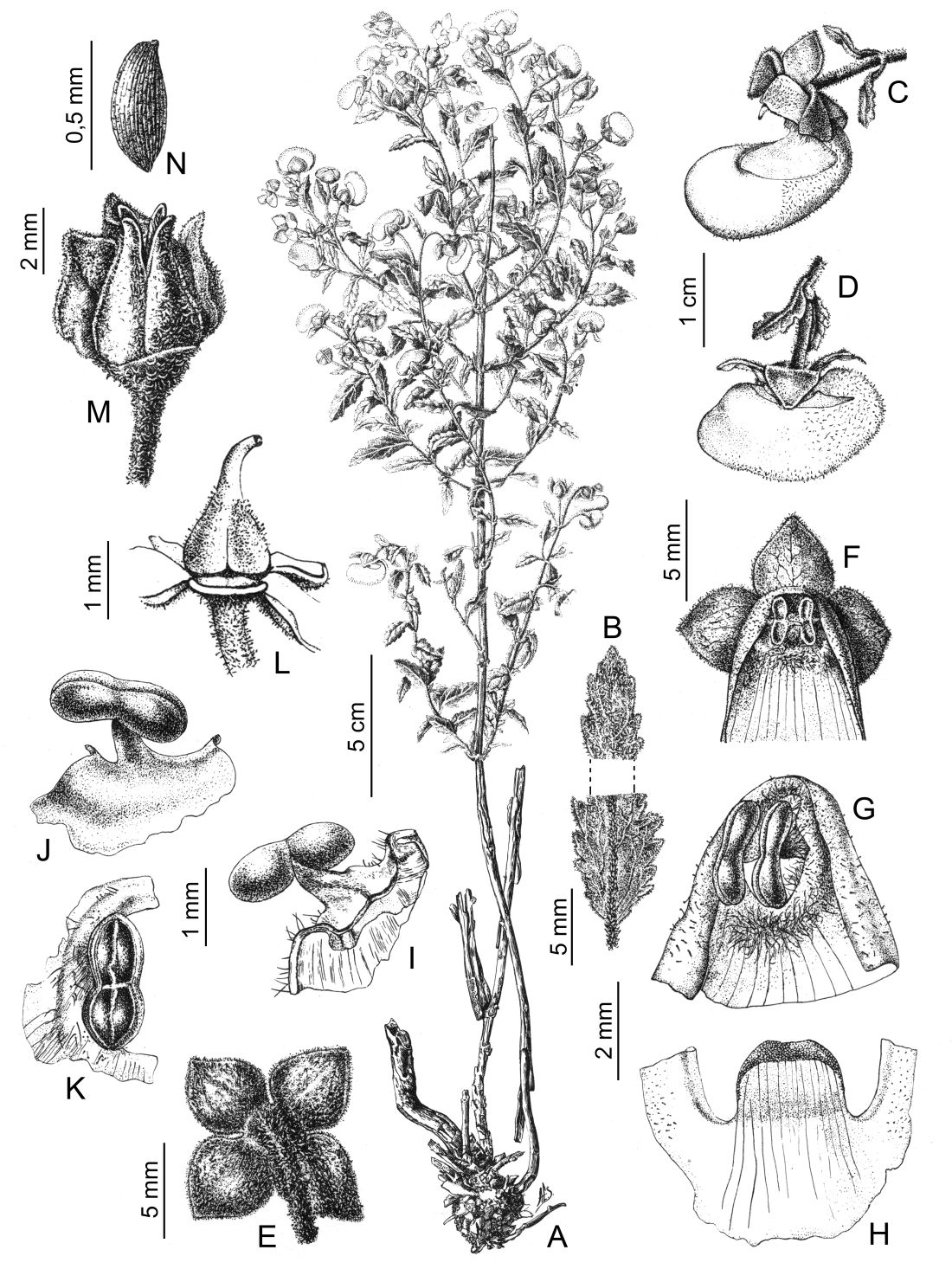 Arbusto erecto o ascendente de 0,1 a 0,8 m de alto, en general pubérulo o cortamente villoso con pelos blancos. Hojas lanceoladas de 1,3-4,6 × 0,4-2,4 cm, herbáceas, agudas en el ápice, cuneadas o redondeadas en la base; superficie adaxial verde fuerte a verde grisácea, laxamente pubérula a cortamente villosa; cara abaxial verde pálida, reticulado venosa con las nervaduras principales estrigosas o pubérulas, espacios intermedios glabros o pubérulos con pelos glandulares amarillentos; margen foliar fuertemente serrado a doblemente aserrado, con 8- 18 dientes a cada lado de la hoja; pecíolos de 2-6 mm de largo, villosos. Inflorescencia cimosa con 1-4 pares de cimas bracteosas que llevan 1-4 flores. Sépalos amarillo-verdoso pálidos, ovados, anchos de 4-6,7 × 3-6 mm, agudos; cara abaxial glandular y villosa y la adaxial pubérula; corola amarillo limón pálido; labio superior cuculado de 2-3 × 5-7 mm; labio inferior sacciforme mucho mayor de 15-20 × 6-12 mm, geniculado, de modo que oculta completamente al labio superior y la garganta, ésta es tan larga como la porción globosa; la garganta es casi blanca; filamentos de los estambres de 0,8-1,6 mm de largo, tecas divaricadas de color castaño; ovario semiínfero, pubérulo- glandular. Cápsula ovoide, acuminada, de 5-8 mm de largo, pubérula-glandular a glabra, cubierta por el cáliz, que es acrescente. Semillas de contorno oblongo, de 0,5 mm de largo, agudas en los extremos.