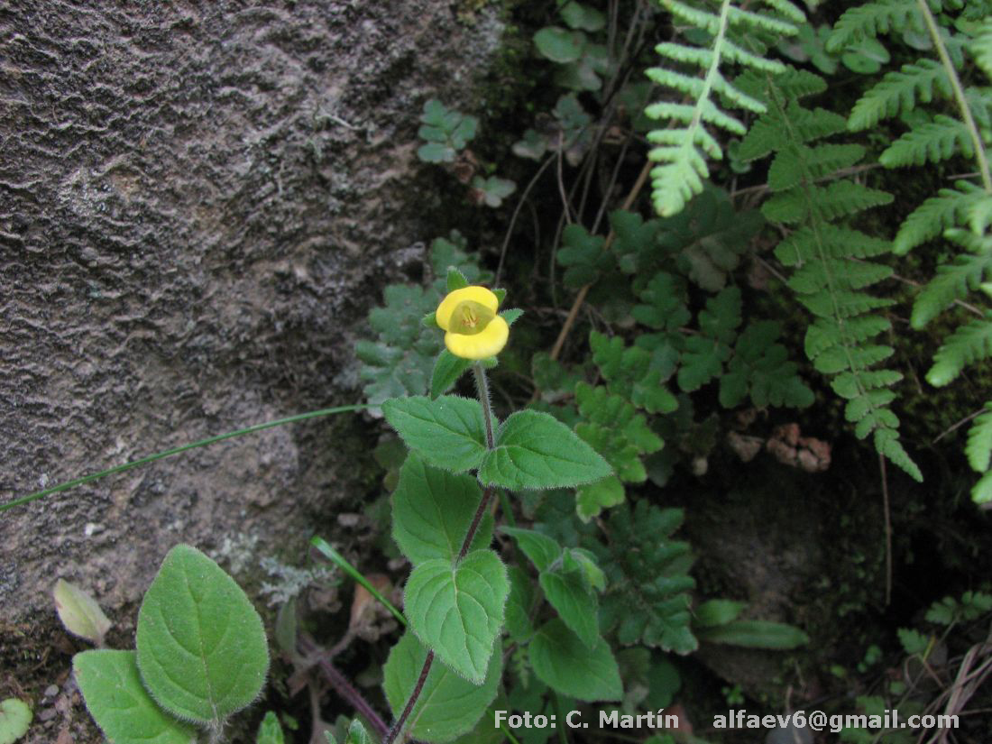 Hierba de 10-40 cm de alto, con tallos laxos, ascendentes, radicantes en los nudos inferiores, delgados, laxamente pubescentes. Hojas elípticas u ovadas de 20-55 × 15-25 mm, membranosas, de color verde intenso y brillante en la cara adaxial, agudas en el ápice, redondeadas o cuneadas en la base; enteras o irregularmente aserradas en el margen, nervaduras marcadas, con pubescencia blanca en ambas caras, tricomas algo más largos en la cara inferior y en el margen; hojas superiores sésiles, las inferiores pecioladas con pecíolo delgado de 8-12 mm de largo. Flores solitarias o geminadas en las axilas de las hojas superiores; pedicelos pubescentes, de 5-8 mm de largo; sépalos ovados, agudos, de 2,5-3,5 × 1,2-2,2 mm, cara abaxial glandular-hirsuta, cara adaxial glabra, margen entero y ciliado; corola amarilla, garganta blanco-cremosa con máculas punctiformes rojas en la base de los estambres; labio superior cuculado, amplio, de 4 × 4 mm, muy separado de las piezas fértiles, interiormente pubescente; labio inferior sacciforme de 6-8 × 4-6 mm, ovoide en vista lateral, levemente arqueado; ambos labios soldados en la base de la garganta lo que la hace profunda y de abertura lenticular; no tiene apéndice ni elaióforo desarrollados; estambres con filamentos de 0,8–1,2 mm de largo y tecas parcialmente deflexas, de color pardo; ovario globoso, semiínfero, pubescente. Cápsula cónica a elipsoide, de 8–10 mm de largo. Semillas elipsoides, hasta de 0,5 mm de largo, rojizas, estriadas longitudinal y transversalmente.