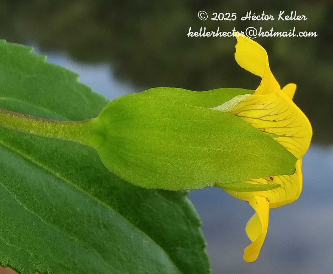 Hierbas de 20-60 cm de alto, glabras. Tallos robustos, de 3- 5 mm de diámetro, cuadrangulares o con costillas, ascendentes o erguidos. Hojas opuestas, subsésiles, láminas ovadas a elípticas, de 20-60 × 7-20 mm, base atenuada, ápice agudo, aserradas, membranáceas. Flores 1 o 2 por nudo; pedicelos de 11- 30 mm de largo; bractéolas lineares, enteras, de 7-11 × 1 mm. Cáliz con sépalo dorsal ovado, de 11-15 × 6,5-8 mm; sépalos ventrales ovados, de 11-13 × 6-7 mm; sépalos internos linear-lanceolados de 10-12 × 1-2 mm, glabros. Corola de 12-15 mm de largo, poco mayor que el cáliz, amarilla, limbo ca. 15 mm de diámetro, labio posterior con pelos claviformes en la cara interna, amarilla, con nervaduras castañas. Estambres laterales con filamentos de 4- 5 mm de largo; estambres ventrales con filamentos de 6-7 mm de largo; anteras elipsoides, de 0,5-0,8 mm de largo. Ovario elipsoide, ca. 3,5 mm de largo; estilo de 1-2 mm de largo. Cápsulas elipsoides, de 5-10 × 5 mm, con cáliz acrescente.