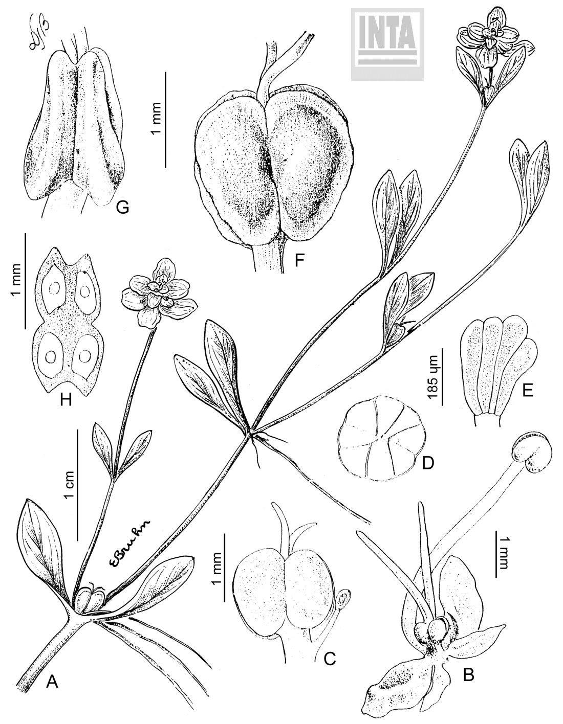 Hierba acuática o terrestre, con nudos inferiores radicantes y nudos apicales con hojas en roseta flotante cuando crece en el agua. Hojas ovadas a angostamente oblongas, de 4-21 × 1,5-9,5 mm, de ápice retuso y base atenuada, trinervas, unidas por vaina linear; pelos peltados en tallos y hojas y pelos flabelados en las axilas foliares. Flores bracteoladas, dispuestas de a pares, 1 pistilada y 1 estaminada, en las axilas de las hojas. Flores estaminadas con estambre erecto hasta de 3-4 mm de largo, a veces la flor no se desarrolla y permanece abortada, casi oculta por la flor pistilada de la misma axila foliar al desarrollarse en fruto. Flores pistiladas con estilodios de 0,6-2,2 mm de largo. Fruto subsésil, de 0,90-1,36 × 1- 1,6 mm, de cara lateral obovada con fosita central breve y bien pronunciada, cara comisural más ancha en la mitad basal, ala ancha, bien manifiesta sobre todo el margen libre de los mericarpos.