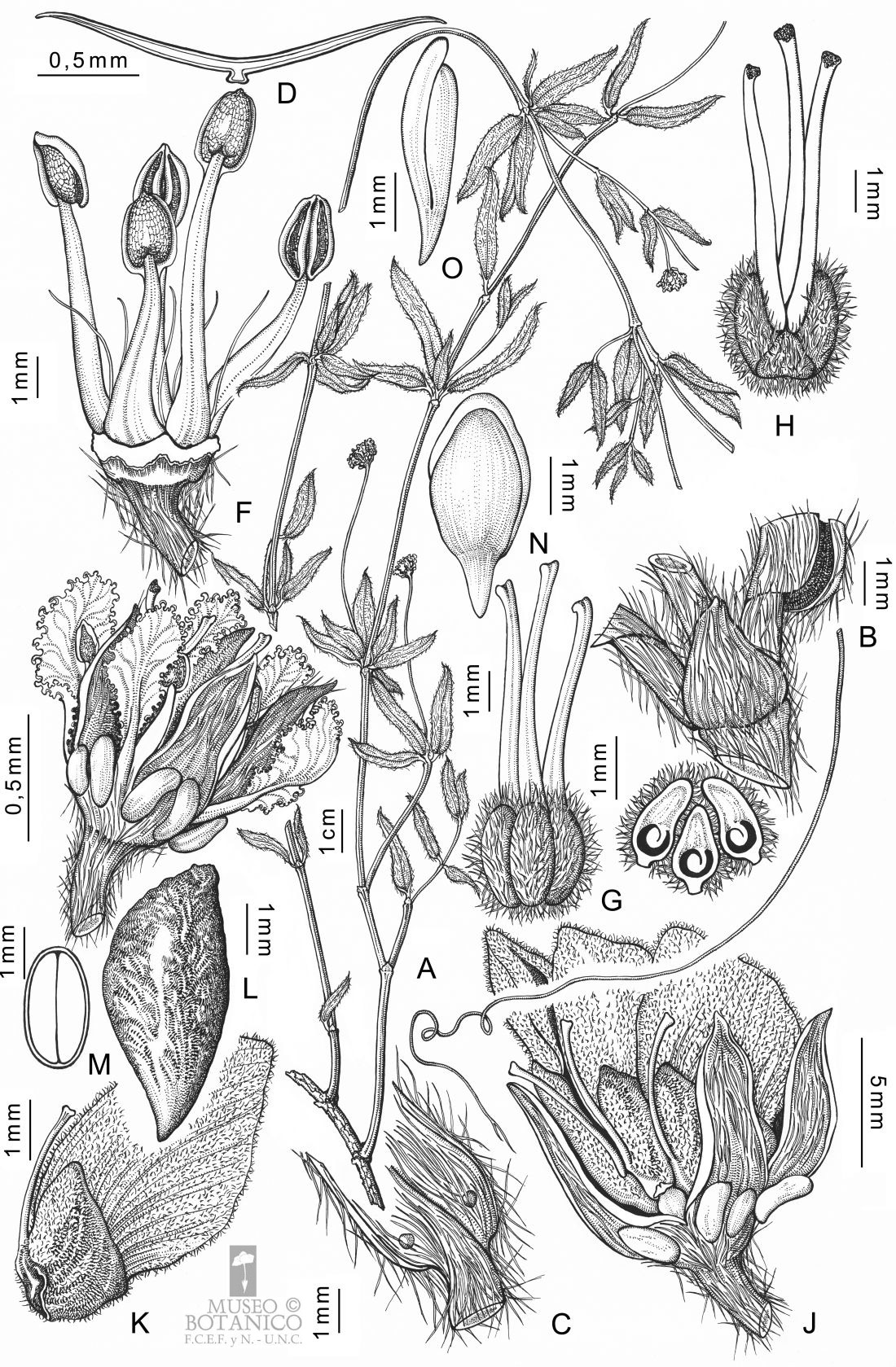 A. Sector de rama. B. Nudo mostrando estípulas soldadas. C. Hoja, vista abaxial mostrando sus 2 glándulas proximales. D. Tricoma malpighiáceo de hoja. E. Flor, vista lateral. F. Androceo. G-H. Gineceo, 2 vistas. I. Transcorte por la hemialtura del ovario. J. Fruto joven con las 3 sámaras. K. Sámara. L. Semilla. M. Transcorte por semilla. N-O. Embriones