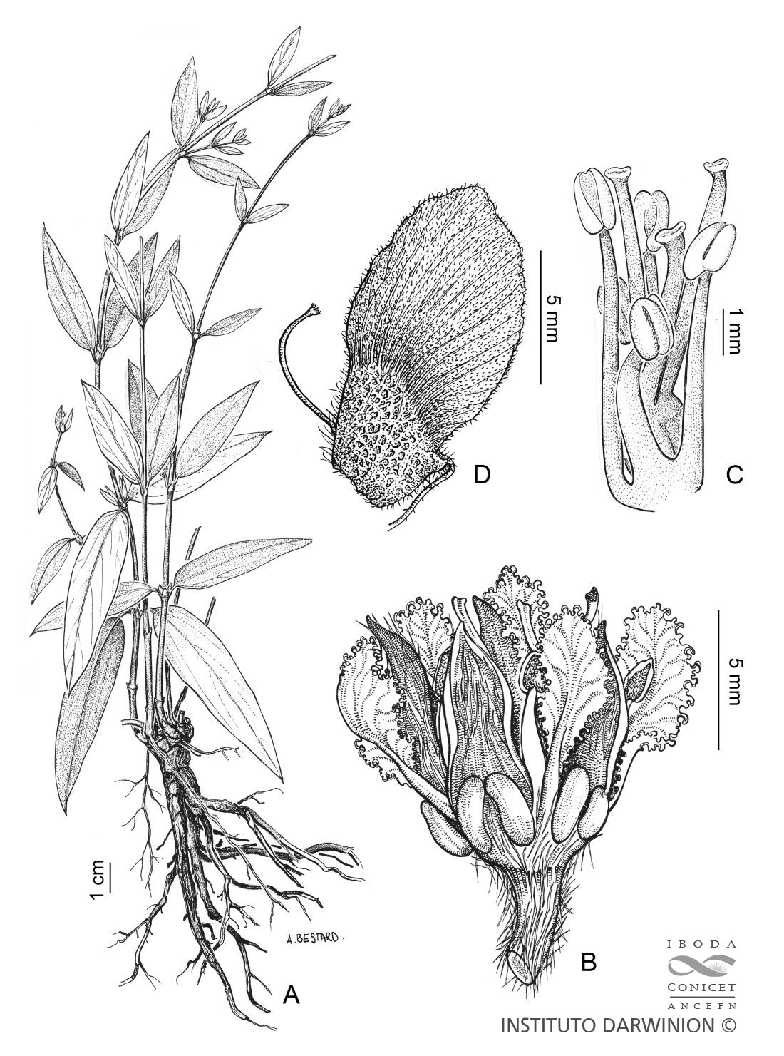 Subarbustos ramificados desde la base, trepadores, seríceos, con entrenudos de 1-10 cm de largo. Hojas con estípulas interpeciolares, anchamente ovadas con ápice frecuentemente 2- lobado, de 1-3 mm de largo; pecíolos de 3-4 mm de largo, seríceos, eglandulares; láminas elípticas a linear-lanceoladas, de 1-4 × 0,5-1,5 cm, de base aguda, ápice acuminado, pubescencia serícea en ambas caras, con 2 glándulas en la región inferior. Inflorescencias en seudoumbelas, simples, con 1-3 flores; brácteas de 10-15 mm de largo, similares a hojas normales; pedúnculos florales y bractéolas ausentes; pedicelos de 1-3 cm de largo, seríceos; sépalos angostamente elípticos, de 6-9 mm de largo, seríceos en la cara abaxial, bordes revolutos en la antesis, glándulas elipsoidales, de 1-2 mm de largo; pétalos de 5-8 × 3-4 mm, obovados, margen fimbriado, glabrescentes en la cara abaxial; androceo con 5 estaminodios, filiformes, de 0,8-1,1mm de largo y 5 estambres fértiles, el posterior con filamento cilíndrico, de 7-8 mm de largo, 2 látero-posteriores ligeramente cónicos, de 4,5-5 mm de largo, y 2 látero-anteriores, cilíndricos, de 6-7 mm de largo, glabros, anteras elipsoides, de 1,5-2,5 mm de largo; ovario de 2-3 mm de largo, hirsuto, con cresta dorsal, estilos de 5-6 mm de largo, arqueados a rectos, ensanchados en el ápice, truncados, con superficie estigmática carnosa. Mericarpos samaroides, castaños, pubescentes, alas oblongas, las laterales de 0,4-0,5 × 0,1-0,2 cm, con borde eroso y ala dorsal de 1,2-1,4 × 0,6-0,8 cm, borde superior entero y borde inferior apenas cóncavo.