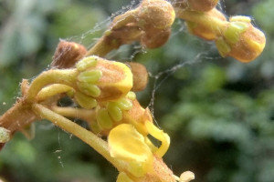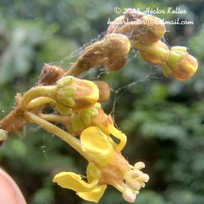 Lianas tomentosas a glabrescentes, con entrenudos de 3- 10 cm de largo. Hojas con estípulas escamiformes, de 0,3-0,5 mm de largo; pecíolos de 0,5-1,5 cm de largo, frecuentemente glabros, canaliculados en la cara adaxial, con 2 glándulas en la base; láminas elípticas, ovadas a obovadas, de 2,5-11 × 2,2-6,2 cm, de base aguda a obtusa, ápice acuminado, a veces emarginado, pubescentes en la cara abaxial, eglandulares. Inflorescencias terminales y axilares, en panículas de seudoumbelas o seudocorimbos; brácteas de 2-4 mm de largo; pedúnculos florales de 2,5-3,5 mm de largo, seríceos; bractéolas de 1-2 mm de largo, seríceas; pedicelos de 4-7 mm de largo, seríceos; sépalos oblongos, de 2,5-3 mm de largo, pubescentes, 4 biglandulosos y el anterior eglanduloso, glándulas elípticas, de 1-1,3 mm de largo; pétalos amarillos, de 4-5 × 2-2,2 mm, limbo obovado y margen denticulado, el posterior semejante, con uña más gruesa; androceo con filamentos triangulares, soldados en la base, de 2-2,5 mm de largo, glabros, generalmente los opositisépalos más largos y con filamentos más delgados, anteras suborbiculares, de 1- 1,2 mm de largo; ovario 3 carpelar, de 1,2-1,4 mm de largo, pubescente, estilos de 2,5-2,7 mm de largo, con ápice redondeado a truncado. Mericarpos samaroides, pardorojizos, ala dorsal oblonga, de 3-3,5 × 1-1,5 cm.