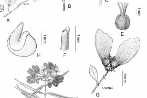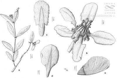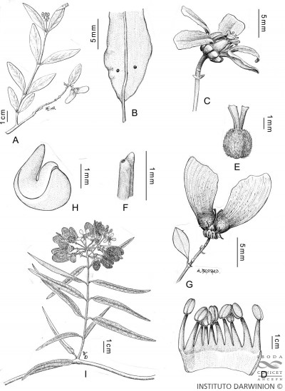 Arbustos apoyantes o lianas, glabros a seríceos, con entrenudos de 0,5-10 cm de largo. Hojas con estípulas escamiformes, de 0,4-0,6 mm de largo, caedizas; pecíolos de 0,5- 0,7 cm de largo, laxamente pubescentes, 0-2 glándulas cerca del ápice; láminas angostamente ovadas, angostamente elípticas a lineares, de 2-11 × 0,5-2,5 cm, de base aguda, ápice agudo, laxamente pubescentes, ocasionalmente con glándulas. Inflorescencias terminales en seudoracimos, seudoumbelas o seudocorimbos, generalmente simples; brácteas de 1-3 mm de largo; pedúnculos florales de 8-10 mm de largo, glabros a levemente pubescentes; bractéolas de 1-1,5 mm de largo, glabrescentes a pubescentes; pedicelos de 2-4 mm de largo, glabros a escasamente pubescentes, rojizos; sépalos ovados, de 3,5-4,2 mm de largo, glabros a escasamente pubescentes, 4 biglandulosos y el anterior eglanduloso, glándulas obovadas, de 1,8-2,2 mm de largo; pétalos amarillos, de 4-9 × 4-5 mm, limbo elíptico, dorso carenado y margen crenado, el posterior con uña más gruesa y limbo oblongo; androceo con filamentos subulados, soldados en la base, de 1-2 mm de largo, glabros, generalmente los opositisépalos más largos, anteras oblongas, de 0,8-1 mm de largo; ovario 3 carpelar, de 1,5- 2 mm de largo, pubescente, estilos de 1,8-3 mm de largo, con ápice uncinado. Mericarpos samaroides, rojizos, castaños a la madurez, ala dorsal obovada, de 0,7-2 × 0,5-0,8 cm.