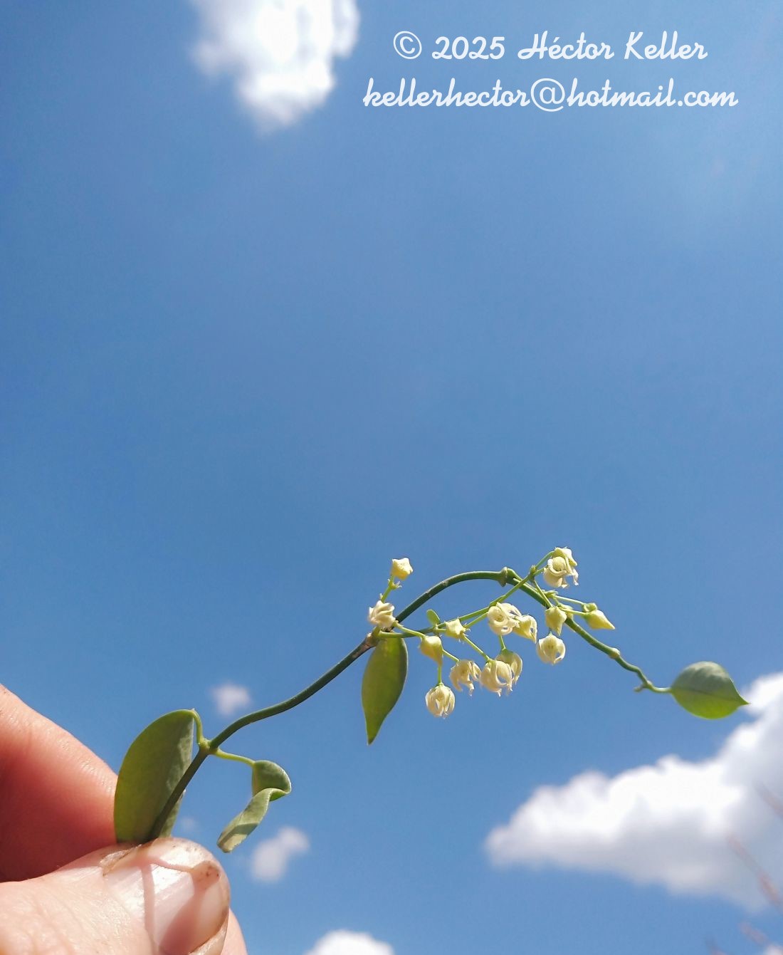 Voluble, ramas glabras. Hojas reflexas; pecíolo de 0,8-1,5 cm de largo, glabro; lámina ovada, de 3,5-6 × 2,7-3,7 cm, discolora, membranácea a cartácea, glabra, ápice agudo a acuminado, base redondeada a levemente cordada, margen levemente revoluto, a veces con tricomas esparcidos. Inflorescencias parciales dicasios laxos, 3-multifloros; pedúnculo de 0,7-2 cm de largo, glabro; brácteas 3 por flor, verdes, lineares a estrechamente-triangulares, de 1-1,6 × 0,2-0,4 mm, a veces esparsamente ciliadas. Flores con pedicelo de 3,5-5 mm de largo, glabro; cáliz con lóbulos ovados, de 1,4-1,6 × 0,6-0,7 mm, glabros en ambas caras, ápice agudo; corola crema, globosa, tubo de 0,7-1 mm de largo, glabro en ambas caras; lóbulos incurvos, estrechamente ovados, cara adaxial pilosa a pubescente, cara abaxial glabra, ápice agudo; corona crema, sobrepasando al ginostegio en altura, lóbulos 3-lobados, de 0,6-0,7 × 1-1,1 mm, fusionados lateralmente entre sí, segmento medio mayor, triangular, ca. 0,6 mm de largo; anteras trapezoidales, de 0,5 × 0,6 mm, apéndice membranáceo ovado a triangular, de 0,2-0,3 × 0,3-0,4 mm; cabeza estilar lenticular, de 0,3 × 0,6 cm, con apéndice de 0,4 mm de largo; retináculo oblongo, de 0,1 × 0,05 mm, caudículas hialinas, horizontales, sinuosas, de 0,02 mm de largo, polinios largamente elipsoides, de 0,1 × 0,06 mm, ápice redondeado. Folículos estrechamente fusiformes, de 7-9 × 0,5-0,6 cm, glabros. Semillas no vistas.