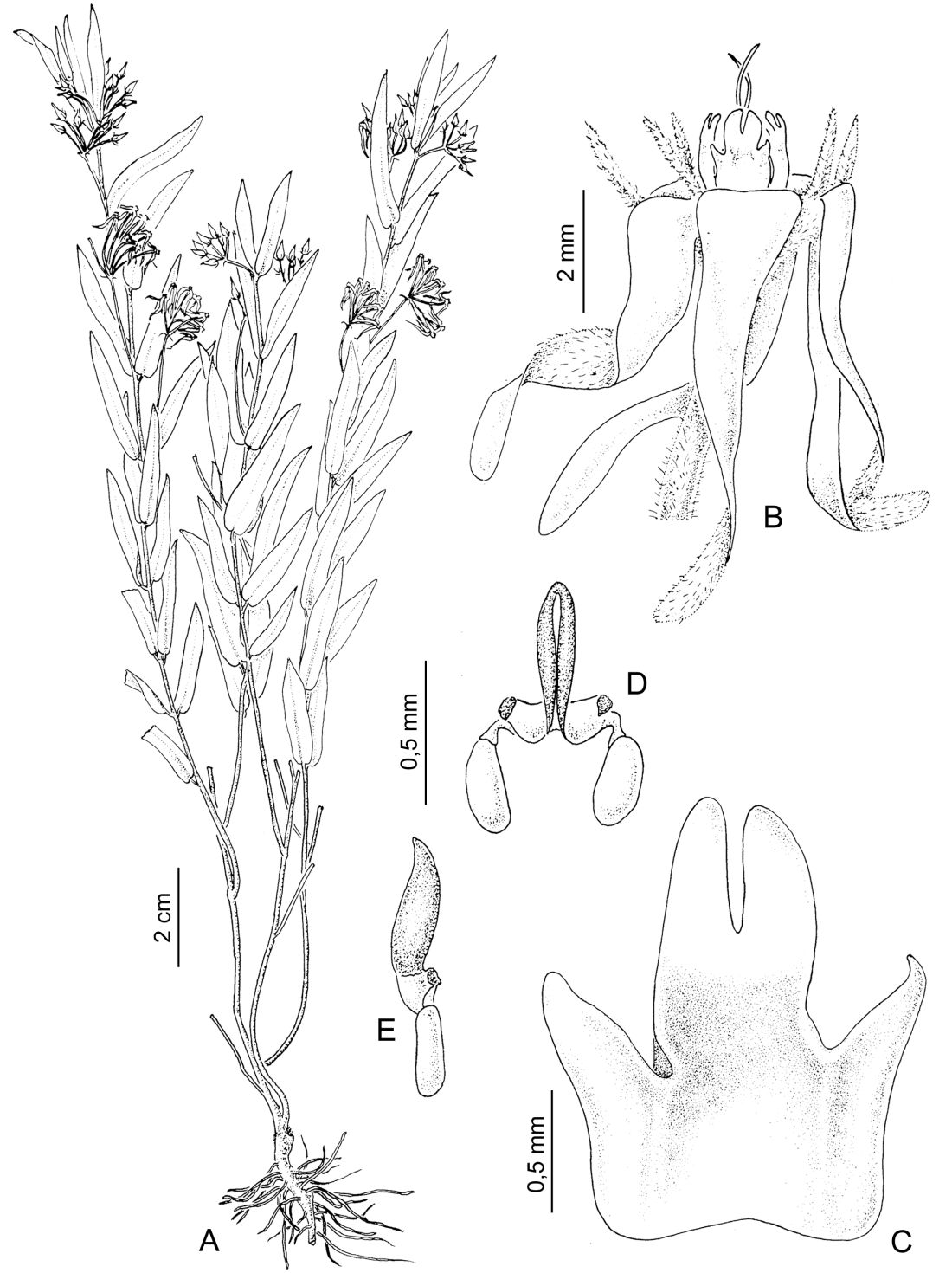 A. Planta. B. Flor. C. Lóbulo de la corona. D-E. Polinario, vistas dorsal y lateral, respectivamente. Tomado de Bonplandia (Corrientes) 7: 33. 1993.