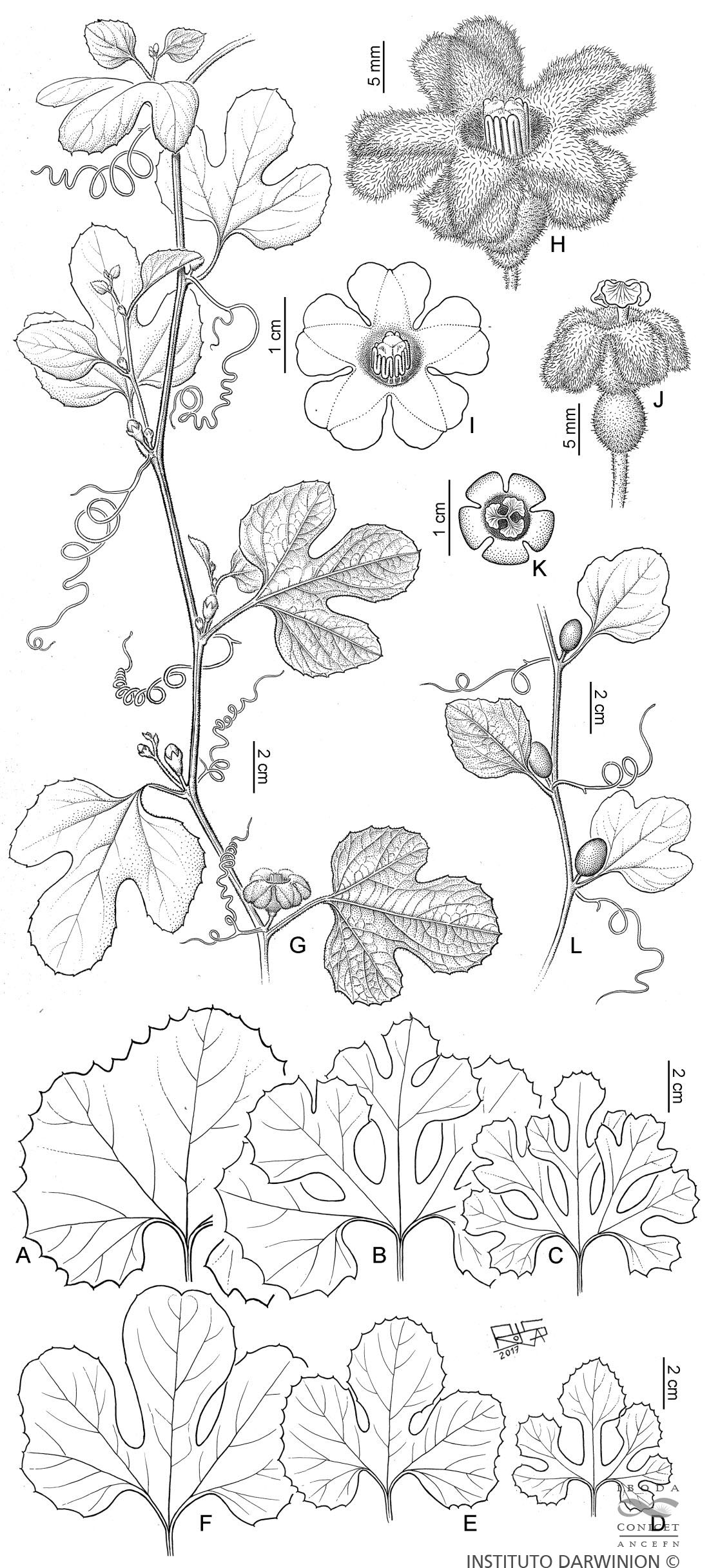 Hemicriptófitos monoicos; tallos plurimetrales. Hojas 3-5- lobuladas o pedatipartidas, con pecíolos de 3-5 cm de largo y láminas de 7-12 × 10-13 cm, con lóbulos espatulados de ápice redondeado; las hojas en los nudos portadores de inflorescencias son 3-palmatipartidas; brácteas reducidas, subuladas, a veces foliosas, deltoideas. Zarcillos 2-3-fidos. Flores solitarias, fasciculadas o en monocasios racemiformes, a veces andróginos, antesis vespertina (19 a 22hs). Flores estaminadas con hipanto de 12-14 × 14-16 mm; sépalos anchamente triangulares, de 1-4 × 3 mm; pétalos de 12 × 12 mm, extendidos, patentes y algo reduplicados en la antesis, algodonosos en la haz, tomentosos en el envés, bordes induplicados anchos; filamentos de 10-12 mm de largo; sinantéreo de 4-7 mm de largo. Flores carpeladas menores; pétalos oblongos, revolutos en la antesis; ovario de 7-8 × 3-4 mm; rudimentos seminales 6; estilo recto o arqueado, de 7-8 mm de largo; estigma con 3 lóbulos espatulado-peltados, lisos. Bayas de 12-20 × 8-9 mm, amarillentas o anaranjadas. Semillas de 6-8 mm de largo; testa generalmente pajiza.