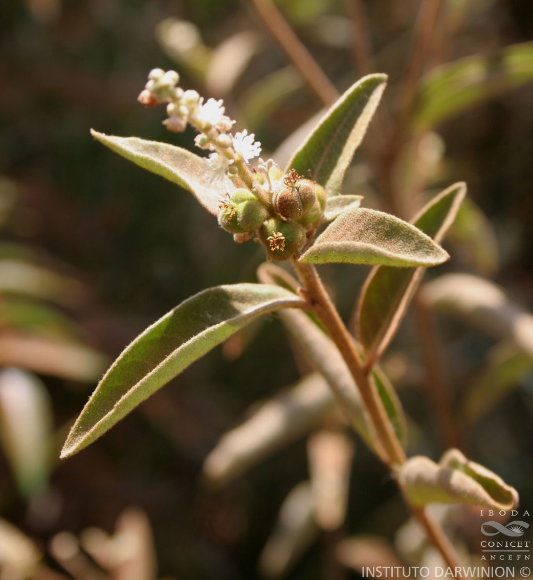 Subarbustos monoicos o subdioicos de 20-80 cm de alto, ocasionalmente arbustos hasta de 1,5 m de alto, con raíz central gruesa, generalmente bien ramificados desde la base, ramas jóvenes con indumento denso de tricomas estrellados estipitados, porrectos, de radio central vertical, más corto que los radios horizontales, éstos orientados en su mayoría en sentido longitudinal. Hojas alternas; pecíolos de 3-7(-13) mm de largo; estípulas subuladas o pequeños dientes, de dorso pubescente y ápice glanduloso, casi ocultas por el indumento del tallo; láminas elípticas, lanceoladas, ovales o rara vez obovadas, de 2-6(-9) × 1,5-4 cm, nervios secundarios 4-7 a cada lado de la nervadura central, poco visibles, ápice obtuso, a veces agudo, apiculado, base aguda a subcordada, margen entero y eglanduloso, glándulas 2, pateliformes-umbonadas y sésiles de 1-1,3 mm de diámetro en la base de la cara abaxial, indumento denso, más acentuado en la cara abaxial, de tricomas estrellados corto-estipitados. Inflorescencias terminales, 2-sexuales o 1-sexuales, de 2-13 cm de largo, las 2-sexuales con 1-6 flores pistiladas y 10-30 flores estaminadas distales; brácteas triangular-alesnadas, de 1,5-2 mm de largo, a menudo con 1 o 2 glándulas adyacentes discoides o semilunadas, frecuentemente de un solo lado del pedicelo de la flor pistilada; brácteas de las flores estaminadas aciculares, sin glándulas discoidales o presentes en las brácteas de flores estaminadas inferiores, brácteas basales con flores pistiladas solitarias, las apicales con flores estaminadas en címulas 1-laterales de 2-3 flores. Flores estaminadas con pedicelo de 1-2,6 mm; sépalos 5, ovales, de 1,7-3 × 0,9-1,8 mm, dorso pubescente; pétalos 5, espatulados, de 2,5-3 × 0,6-1,1 mm, barbados en la base y pilosos en el margen; estambres 12-17, filamentos pilosos en la base; disco de 5 lóbulos libres, glabros. Flores pistiladas subsésiles; sépalos 5, triangulares, de 1,5-3 mm de largo, iguales o desiguales, densamente pubescentes en la cara externa, glabros o con tricomas ralos en la cara interna; pétalos atrofiados, filiformes o subulados, con glándula apical, a veces poco visibles, glabros o con tricomas ralos; disco 5-lobado; ovario subgloboide o de contorno oblongo, de 1-1,5 × 1,5-1,8 mm, densamente pubescente; estilos 3, 2-fidos, con 6 terminaciones estigmáticas de 2,5-5 mm de largo, las ramas pubescentes desde erguidos hasta patentes en la antesis. Fruto cápsulas oblongo-globoides, de 5-7 × 4-5,5 mm, tomentosas, con tricomas estrellados uniformes; columela de 4-5,5 mm de largo, con 3 lóbulos lisos, agudos y ascendentes. Semillas oblongo-elipsoides, de 4-6 × 3-4 mm, pardas a negruzcas, lisas; carúncula subapical blancuzca, lateralmente alada y 2-cornulada en el ápice.