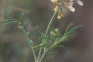 Hierba O SUFRÚTICE ? de ca. 50 cm alt., base leñosa. Tallos laxos, decumbentes, rala y finamente blanco- estrigoso. Hojas de (2-) 4-8 cm long. incluído el pecíolo de 0,25-1 cm long.; estípulas pequeñas, amplexicaules, profundamente bidentada, membranáceas, ciliadas y ralamente estrigosas; folíolos (3-) 5-8 (-9) yugados con impar, de 12-23 (-28) mm long. x 1,5-2,5 (-3.5) mm lat, oblongo lineares, obtusos, membranosos, de superficie adaxial ralamente estrigosa a glabrescente y la abaxial glabrescente. Pedúnculos de 3-7 (-10) cm long. mayores que las hojas, con racimos densos (11-) 15-30-floros en su mitad o tercio superior; brácteas y bractéolas lanceoladas? OJO, RECORDAR QUE NO SE USA ESTE TÉRMINO presentes. Flores azul-violáceas, brevipediceladas; cáliz campanulado, estrigoso, de (2,5-) 3-3,5 mm long. con dientes agudos, menores que el tubo; estandarte de 0,60-0,7 cm long. x 0,4-0,5 cm lat., alas elípticas de ápice aguzado y generalmente enrollado, subiguales al estandarte; quilla truncada de 0,45-0,55 cm long.; ovario linear, pubescente a glabro. Fruto legumbre subbilocular, de 1-1,2 (-1,4) cm long. x 0,25-0,3 cm lat., ovoide oblonga, coriácea, turgente, glabrescente a glabra, de base ancha, redondeada y conspicuamente convexa a ambos lados de la sutura dorsal y ventral en la mitad basal, ápice aguzado; en vista lateral falcada, sutura dorsal invaginada con reborde membranoso de 0,2 -0,5 mm, superficie interna del fruto con desprendimiento del endocarpo y de aspecto telarañoso. Semillas ca. 12, reniformes.