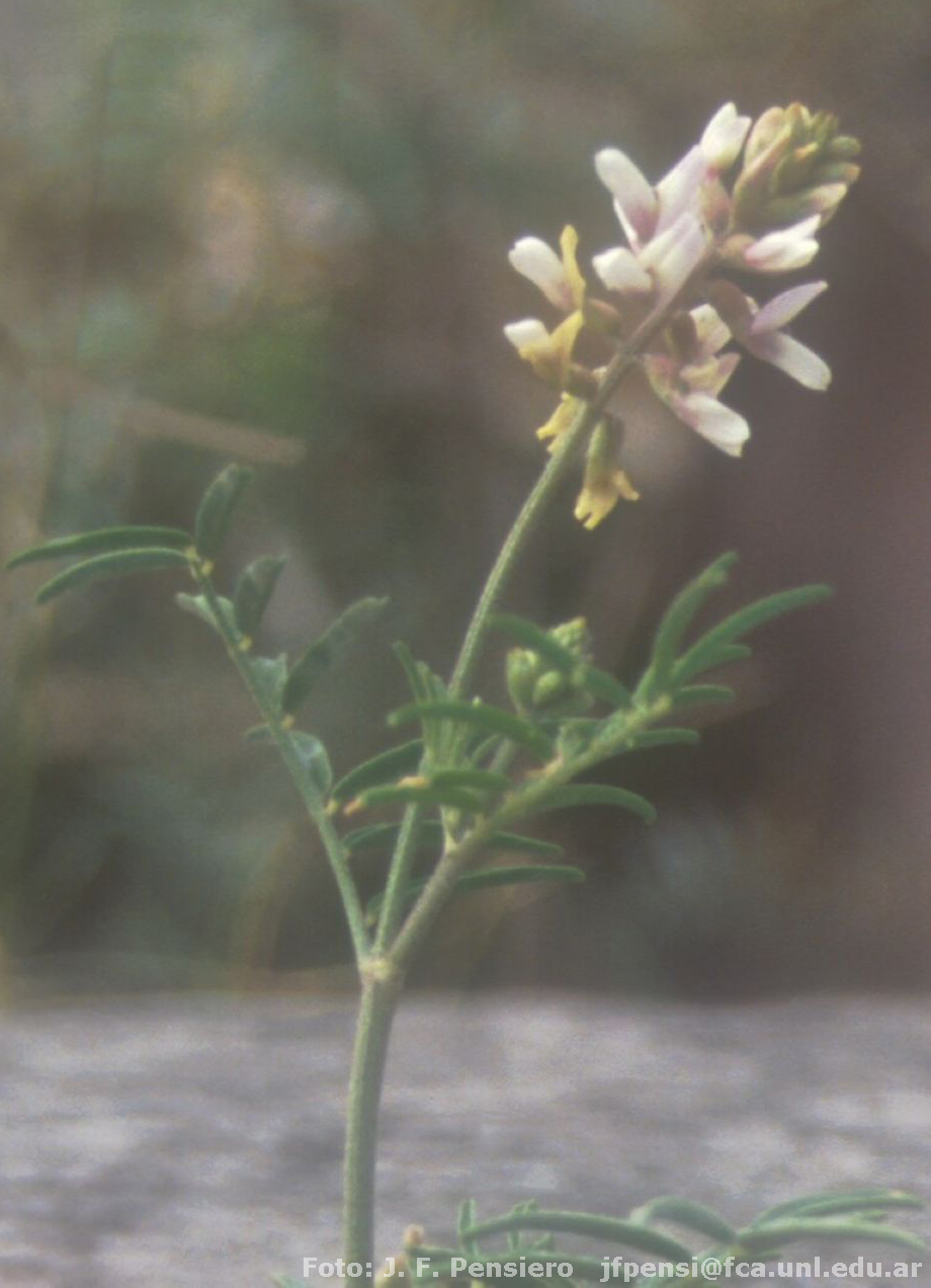 Hierba O SUFRÚTICE ? de ca. 50 cm alt., base leñosa. Tallos laxos, decumbentes, rala y finamente blanco- estrigoso. Hojas de (2-) 4-8 cm long. incluído el pecíolo de 0,25-1 cm long.; estípulas pequeñas, amplexicaules, profundamente bidentada, membranáceas, ciliadas y ralamente estrigosas; folíolos (3-) 5-8 (-9) yugados con impar, de 12-23 (-28) mm long. x 1,5-2,5 (-3.5) mm lat, oblongo lineares, obtusos, membranosos, de superficie adaxial ralamente estrigosa a glabrescente y la abaxial glabrescente. Pedúnculos de 3-7 (-10) cm long. mayores que las hojas, con racimos densos (11-) 15-30-floros en su mitad o tercio superior; brácteas y bractéolas lanceoladas? OJO, RECORDAR QUE NO SE USA ESTE TÉRMINO presentes. Flores azul-violáceas, brevipediceladas; cáliz campanulado, estrigoso, de (2,5-) 3-3,5 mm long. con dientes agudos, menores que el tubo; estandarte de 0,60-0,7 cm long. x 0,4-0,5 cm lat., alas elípticas de ápice aguzado y generalmente enrollado, subiguales al estandarte; quilla truncada de 0,45-0,55 cm long.; ovario linear, pubescente a glabro. Fruto legumbre subbilocular, de 1-1,2 (-1,4) cm long. x 0,25-0,3 cm lat., ovoide oblonga, coriácea, turgente, glabrescente a glabra, de base ancha, redondeada y conspicuamente convexa a ambos lados de la sutura dorsal y ventral en la mitad basal, ápice aguzado; en vista lateral falcada, sutura dorsal invaginada con reborde membranoso de 0,2 -0,5 mm, superficie interna del fruto con desprendimiento del endocarpo y de aspecto telarañoso. Semillas ca. 12, reniformes.