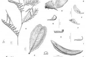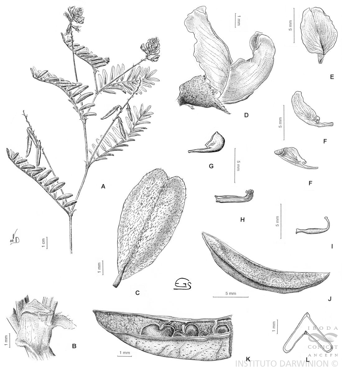 A. Rama con flores y frutos. B. Estípulas. C. Folíolo. D. Flor. E. Estandarte. F. Alas. G. Quilla. H. Androceo. I. Gineceo. J. Fruto. K. Corte longitudinal del ápice. L. Transcorte