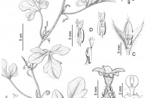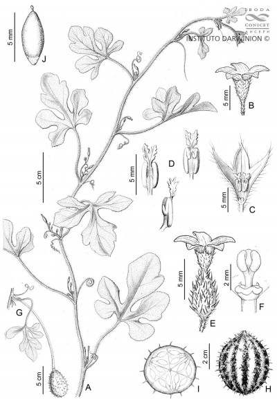 Terófitos diclinomonoicos. Hojas 5-7-pedatipartidas; pecíolos de 2-13 cm; láminas de 2-9 × 2-8 cm. Fascículos estaminados 2-10-floros, raro flores solitarias; pedicelos de 9-20 mm de largo. Flores estaminadas con hipanto campanulado, de 3-4,5 mm de largo; sépalos de 1-2 mm de largo; pétalos de 4-7 × 2-4 mm. Flores carpeladas solitarias, con pedicelos de10-90 mm de largo; ovario de 5-10 mm de largo, cubierto de espinas o tubérculos setulosos. Frutos de 2,5-5 × 2-3,5 cm, con tubérculos o espinas hasta de 5 mm de largo; pedúnculos de 30-130 mm de largo. Semillas de 4,5-5 × 2-2,5 × 1 mm, con saco ariloide traslúcido.