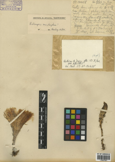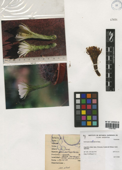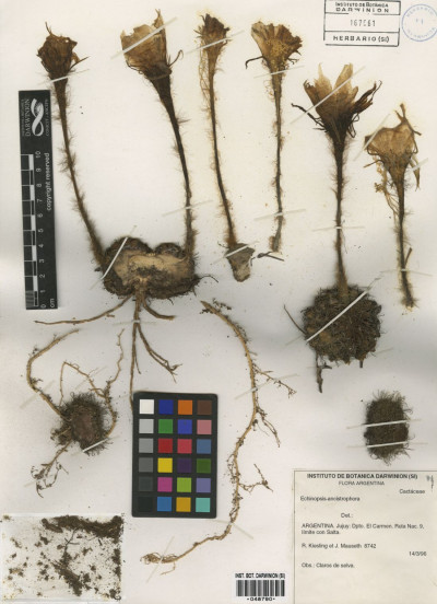 [Exsiccata: Not located. According to Kiesling (Cactáceas publicadas por el Dr. Carlos Spegazzini: 219. 1984) the type specimen was not found.-Photographs: LP: 'Echinopsis ancistrophora Speg. (typus)". Reproduced by Britton and Rose (Cact. 3: 69, fig. 86. 1922)].=> Katinas et al., Darwiniana 42: 187. 2004.