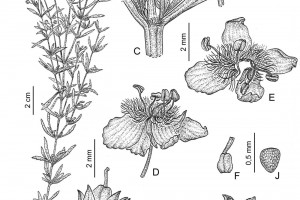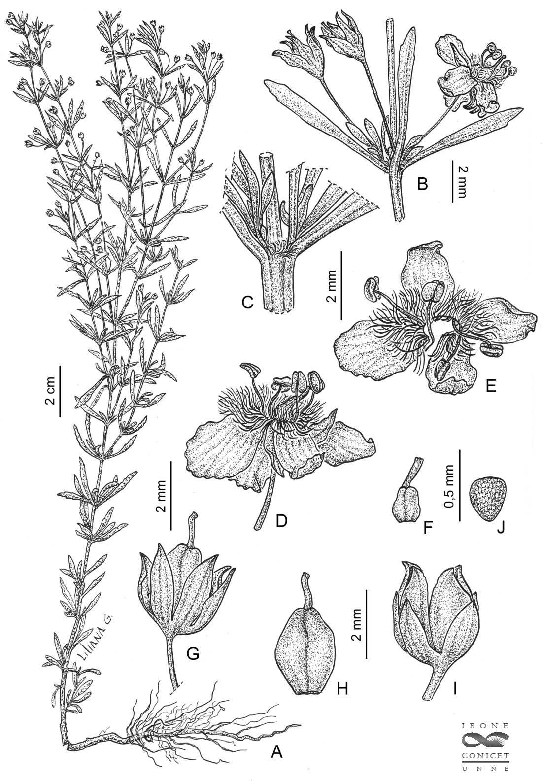 A. Planta. B. Detalle del nudo con hojas y flores. C. Detalle de pubescencia del nudo. D. Flor. E. Corola abierta. F. Gineceo. G. Gineceo maduro con cáliz. H. Gineceo maduro. I. Fruto. J. Semilla.