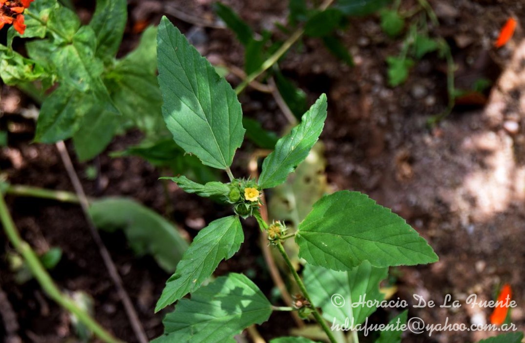 Subarbusto hasta de 1,50 m de altura, cubierto de pelos de cuatro ramas, adpresos. Estípulas filiformes o lanceoladas, de 5 mm de largo. Pecíolos igual o más cortos que la lámina. Lámina triangular, de margen crenado-aserrado, muy variable en tamaño y proporciones, con ambas caras con pelos simples o poco ramificados, esparcidos. Flores axilares, solitarias, subsésiles o cortamente pedunculadas, o formando pseudo-glomérulos sobre braquiblastos. Calículo de 3 bractéolas filiformes, de 5 mm de largo. Cáliz algo acrescente, mide 7 mm de largo durante la antesis; lóbulos triangulares de 3 mm de largo. Corola amarilla, algo más larga que el cáliz. Pétalos 7 × 3-4 mm. Tubo estaminal de 3 mm de largo. Carpelos ca. 12, uniovulados, óvulo erecto. Fruto esquizocárpico. Mericarpos 2 × 3 mm, indehiscentes, ápice hirsuto, provisto de 2 aristas subapicales horizontales y una apical, vertical, pilosas; caras laterales con costillas convergentes hacia el seno ventral, cara dorsal plana, lisa. [Tallos de 25-100 cm de alto, erectos, con pubescencia estrellada. Hojas alternas; lámina ovada a triangular, de 2-8 cm, margen irregularmente dentado a crenado; ápice agudo; pecíolo de 0,8-2 cm; estípulas filiformes a lanceoladas, de 6-7 mm. Flores solitarias axilares o agrupadas, pedúnculos cortos. Calículo de 3 brácteas filiformes, de 5 mm. Cáliz campanulado, unido en la base, con 5 lóbulos de 3 × 2 mm. Pétalos 5, libres, asimétricos, amarillos, de 7-10 × 3-4 mm. Estigmas capitados. Fruto formado por 12-13 mericarpos, indehiscentes, cada uno con una arista corta y dos espinas dorsales.]