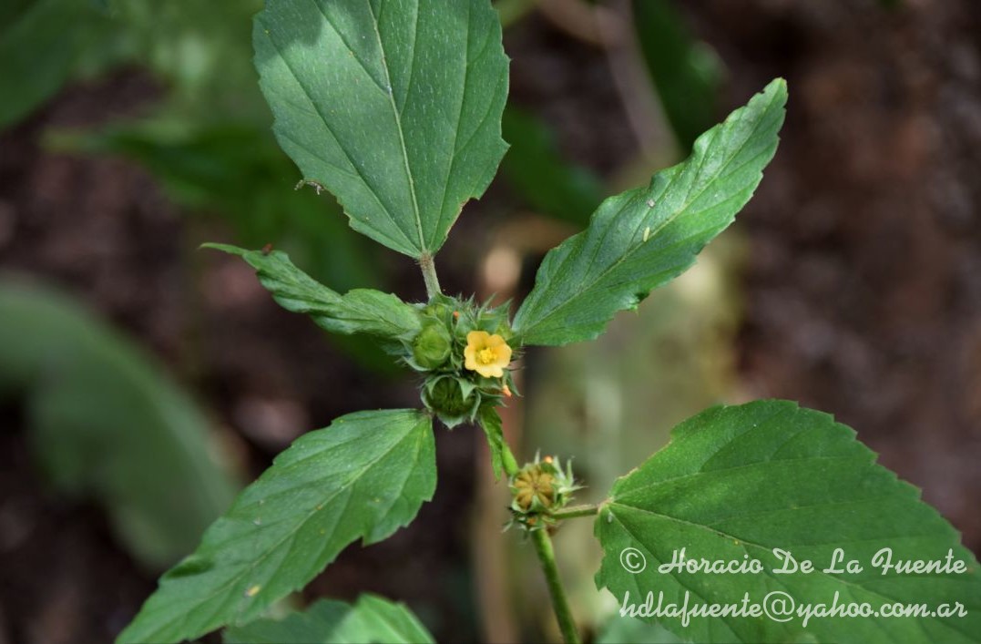 Subarbusto hasta de 1,50 m de altura, cubierto de pelos de cuatro ramas, adpresos. Estípulas filiformes o lanceoladas, de 5 mm de largo. Pecíolos igual o más cortos que la lámina. Lámina triangular, de margen crenado-aserrado, muy variable en tamaño y proporciones, con ambas caras con pelos simples o poco ramificados, esparcidos. Flores axilares, solitarias, subsésiles o cortamente pedunculadas, o formando pseudo-glomérulos sobre braquiblastos. Calículo de 3 bractéolas filiformes, de 5 mm de largo. Cáliz algo acrescente, mide 7 mm de largo durante la antesis; lóbulos triangulares de 3 mm de largo. Corola amarilla, algo más larga que el cáliz. Pétalos 7 × 3-4 mm. Tubo estaminal de 3 mm de largo. Carpelos ca. 12, uniovulados, óvulo erecto. Fruto esquizocárpico. Mericarpos 2 × 3 mm, indehiscentes, ápice hirsuto, provisto de 2 aristas subapicales horizontales y una apical, vertical, pilosas; caras laterales con costillas convergentes hacia el seno ventral, cara dorsal plana, lisa. [Tallos de 25-100 cm de alto, erectos, con pubescencia estrellada. Hojas alternas; lámina ovada a triangular, de 2-8 cm, margen irregularmente dentado a crenado; ápice agudo; pecíolo de 0,8-2 cm; estípulas filiformes a lanceoladas, de 6-7 mm. Flores solitarias axilares o agrupadas, pedúnculos cortos. Calículo de 3 brácteas filiformes, de 5 mm. Cáliz campanulado, unido en la base, con 5 lóbulos de 3 × 2 mm. Pétalos 5, libres, asimétricos, amarillos, de 7-10 × 3-4 mm. Estigmas capitados. Fruto formado por 12-13 mericarpos, indehiscentes, cada uno con una arista corta y dos espinas dorsales.]