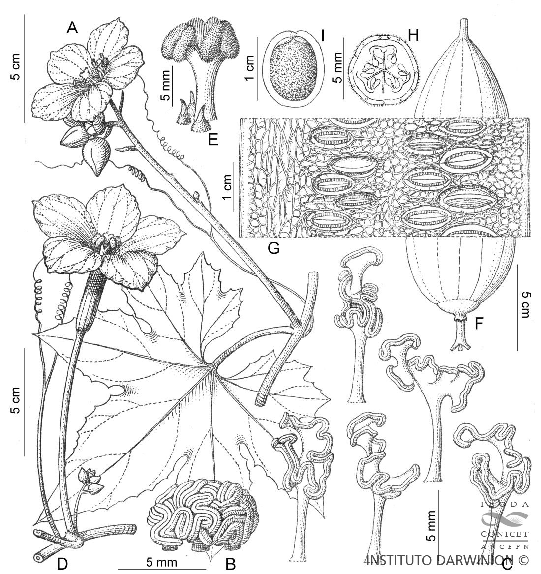 Vástagos finamente pubescentes. Pecíolos de 2-15 cm de largo; láminas ovado-cordadas, de 6-18 × 6-21 cm, 5-lobadas o 5-pedatipartidas. Zarcillos 3-5-fidos. Monocasios estaminados 10-30-floros, de 12-35 cm de largo, acompañados por una probráctea liguliforme de 3 mm de largo. Flor estaminada con una bráctea glandular pequeña; hipanto de 4-8 × 5-7 mm; sépalos de 8-12 mm de largo; pétalos obovados, de 25-45 × 18-35 mm. Flores carpeladas con ovario cilíndrico, de 20-36 × 4-7 mm, piloso. Pixidios cilíndricos de 6-30 × 2,5-7 cm, glabros. Semillas de 10-12 × 6-8 × 2-3 mm.
