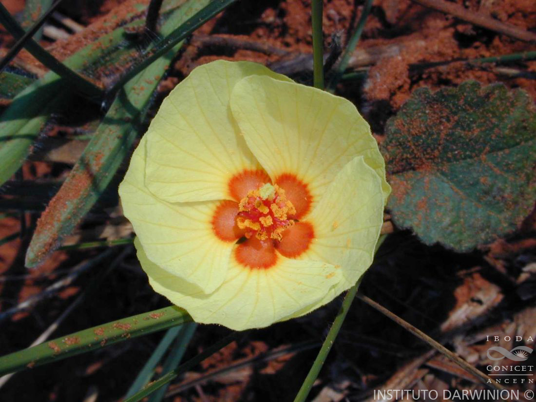 Plantas perennes, con los tallos arrastrándose a partir de un patrón leñoso, hirsutos con pelos de 1-2 mm de largo y con un sotobosque de pelos finos estelares, o a veces con los pelos largos ausentes, raramente glabra. Hoja orbicular, profundamente cordada, crenado-dentado, obtuso o subagudo, 1,5-5 × 2-6,5 cm, palmati 7-nervada suavemente con pelos estrellados, algo descolorido. Pecíolos de 1-6 cm de largo. Estipulas subuladas, 4-8 mm de largo. Flores solitarias en las axilas de las hojas, los pedicelos de 2-9 cm de largo. Brácteas involucelares 9-11, lineales-lanceoladas, 6-10 × 1 mm (más cortas que a más largas que el cáliz), pubérulas o ciliadas, a veces viscosas. Cáliz de 7-10 mm de largo, pubescente. Corola de 1,5-2,5 cm de largo, de color amarillo (secado rojizo) con un centro rojo marcadamente definido, pubescente en los márgenes de la garra. Columna estaminal de 7-9 mm de largo, rojiza (al menos básicamente), filamentos de 1-2 mm de largo, anteras purpúreas. Estilos emergentes de la columna, unidos excepto por distal 1 mm, casi igualando los pétalos. Frutos oblatos, de 9-10 mm de diámetro, glabros, los mericarpos de 5-6 mm de altura, más o menos estriados y reticulados, a veces la cresta proyectada subapicalmente en una protuberancia triangular. Semillas de 5 mm de largo, estriado. [Subarbustos prostrados a decumbentes; ramos partindo de um grande xilopódio, com tricomas simples, longos e hirsutos, podendo estar ausentes, raros tricomas estrela- dos longos e com uma cobertura de tricomas estrelados curtíssimos mais densa. Folhas com lâminas orbiculares, 1,2-4,8 x 2,9-5,3 cm, base cordada, 7 a 9 nervuras basais, face adaxial e abaxial com tricomas estrelados curtos; estípulas subuladas, 4-8 mm compr. Flores axilaressolitárias; pedicelos 5-10,6 cm compr.; epicálice com 8-10 bractéolas, linear-lanceoladas, 10-13 x 1-1,5 mm; corola amarela, com uma mancha vermelha na base superior de cada pétala, tornando-se vermelha quando seca, 2,9-3,5 x 2,2-3,3 cm; tubo estaminal 10- 13 mm compr. Mericarpos 7-8 x 5-6 mm, múticos, sem ornamentações ou seja, lisos, deiscentes dorsalmente, esparsamente pubescentes e verrucosos no ápice.]
