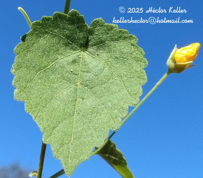 Arbusto de 1-1,50 m de altura, estrellado-tomentoso. Estípulas pequeñas, tempranamente caducas. Pecíolo hasta de 4 cm de largo. Lámina cordiforme, ápice agudo y base con seno relativamente profundo, algunas hojas oscuramente lobadas, palmatinervada, hasta de 6,5 × 5,5 cm, margen dentado, ambas caras estrellado-tomentosas. Flores solitarias o en glomérulos axilares paucifloros. Pedúnculos hasta de 3,5 cm de largo, articulados cerca del ápice. Cáliz de 5 mm de largo, acrescente, estrellado-tomentoso. Corola de 8-10 mm de largo, amarilla. Tubo estaminal de 2 mm de largo, estambres numerosos. Fruto de 8 carpelos 3-seminados. Mericarpos de 6 × 3 mm y con un par de aristas apicales de 1 mm de largo, cubiertos de pelos estrellados diminutos en las partes expuestas. Semillas reniformes, algo pubescentes. Cromosomas: 2n = 16.