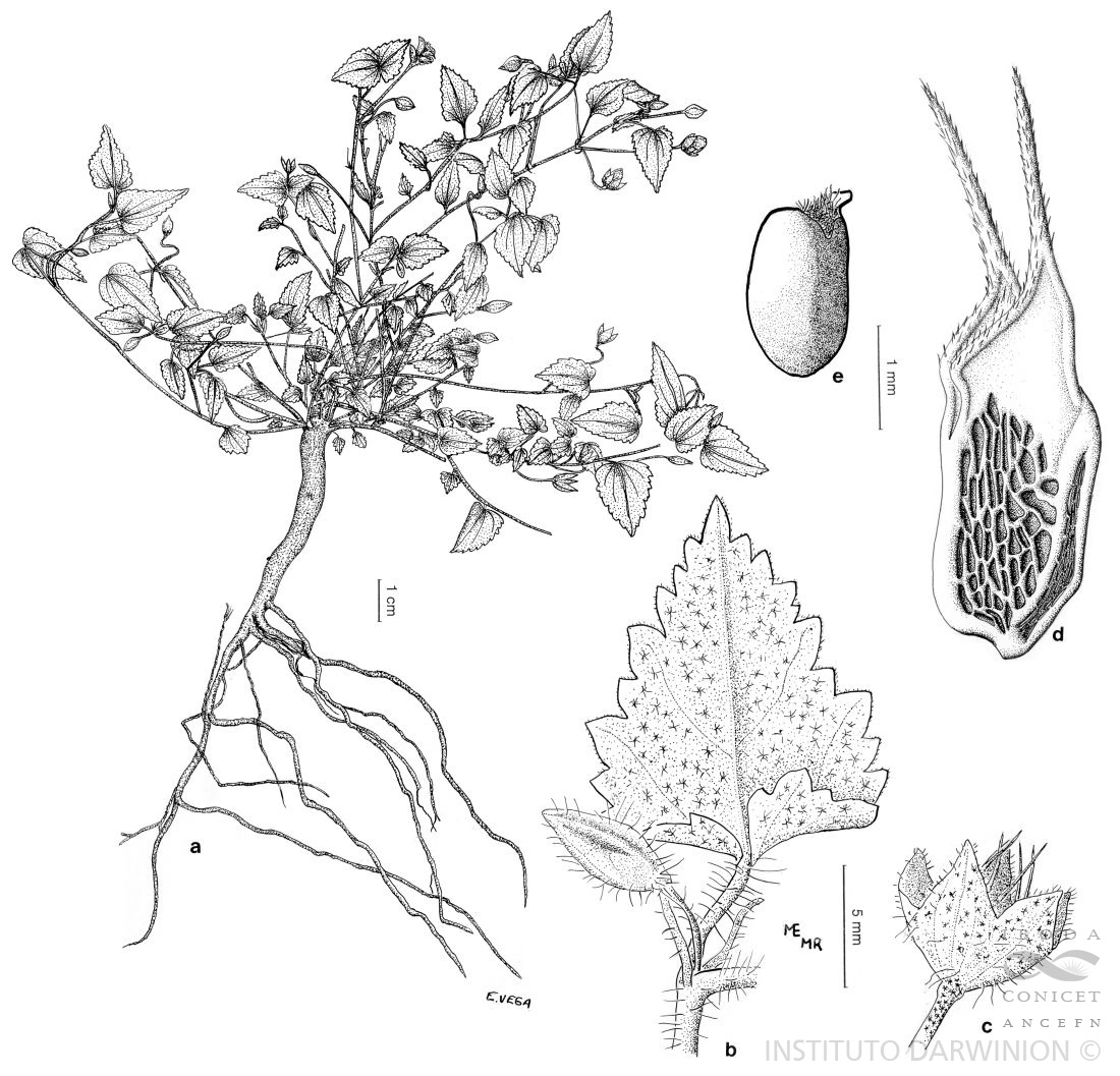 Hierba perenne, hemicriptófita, decumbente. Eje central de 30-40 cm de altura, ramas extendidas en el suelo o apoyantes hasta de 50 cm de largo. Tallo con pelos simples de 2-3 mm de largo y pelos glandulares pequeños, esparcidos. Estípulas lineares de 4-5 mm de largo, con pelos largos, blancos y brillantes. Pecíolo de 10-30 mm de largo, con tomento similar al del tallo. Lámina ovada, base acorazonada, ápice agudo, margen crenado-aserrado desde la base, 2,5-4 × 1,5-2,5 cm; ambas caras con pelos simples de 1-1,5 mm de largo, adpresos. Flores axilares solitarias, largamente pediceladas, con frecuencia ramitas accesorias con flores cortamente pediceladas. Pedicelos articulados, de 10-50 mm de largo, en las ramitas axilares de 3-5 mm de largo, con tomento similar al del tallo. Cáliz campanulado, de 6-7 mm de largo, lóbulos triangulares 4 × 2 mm, con pelos glandulares y abundantes pelos simples de 1-2 mm de largo. Corola amarilla, pétalos 6-7 × 4-5 mm, glabros. Tubo estaminal de 2-2,5 mm de largo, con pelos simples, hialinos. Ovario 5-carpelar. Mericarpos trígonos, 2,5-4,5 × 1,5 mm, y un par de aristas apicales de 1-2 mm de largo, cara dorsal reticulada y con el nervio medio sobresaliente, caras laterales frágiles, con retículo poco marcado, ápice con pelitos simples y aristas con pequeños pelos antrorsos. Semilla glabra, excepto pocos pelos breves en el ápice. [Hemicriptófita decumbente. Tallos largos, poco ramificados, con pelos largos simples, ca. 2 mm de largo, pelos glandulosos y algunos estrellados. Pecíolo más corto que la lámina, híspido. Lámina foliar aovada, acuminada, de base cordada, palmatinervada, 2,5-4 × 1,5-2,5 cm, margen aserrado-crenado, con dientes anchos mucronados; haz con pelos hirsutos, simples o poco ramificados, brillantes y con pelos glandulares; envés con pelos hirsutos, simples o poco glandulares. Flores axilares, solitarias; pedicelos más largos que las hojas, hirsutos, articulados. Cáliz campanulado, plegado, pelos estrellados largos sobre los nervios principales, el resto con pelos estrellados más cortos. Pétalos amarillos, iguales o algo más largos que el cáliz. Ovario con 5 carpelos. Mericarpos de 3-4 mm de largo, prismático-triangulares, con el dorso y las caras laterales reticuladas, dehiscentes en ápice, con dos aristas divergentes, de 1-2 mm de largo, que tienen pelos muy cortos, simples, dirigidos hacia el ápice. Semilla solitaria, glabra, cubierta con una capa blanquecina y con un penacho de pelos en el ápice, rodeando al hilo.]