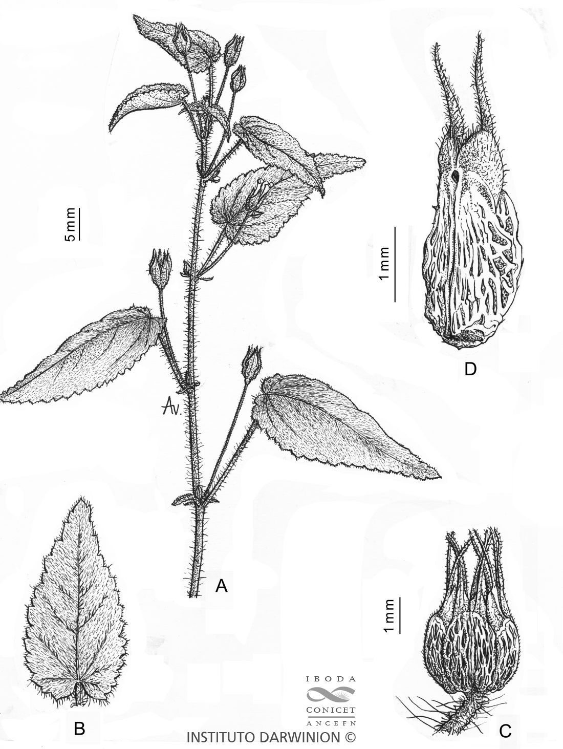 Hierba perenne, hemicriptófita, decumbente. Eje central de 30-40 cm de altura, ramas extendidas en el suelo o apoyantes hasta de 50 cm de largo. Tallo con pelos simples de 2-3 mm de largo y pelos glandulares pequeños, esparcidos. Estípulas lineares de 4-5 mm de largo, con pelos largos, blancos y brillantes. Pecíolo de 10-30 mm de largo, con tomento similar al del tallo. Lámina ovada, base acorazonada, ápice agudo, margen crenado-aserrado desde la base, 2,5-4 × 1,5-2,5 cm; ambas caras con pelos simples de 1-1,5 mm de largo, adpresos. Flores axilares solitarias, largamente pediceladas, con frecuencia ramitas accesorias con flores cortamente pediceladas. Pedicelos articulados, de 10-50 mm de largo, en las ramitas axilares de 3-5 mm de largo, con tomento similar al del tallo. Cáliz campanulado, de 6-7 mm de largo, lóbulos triangulares 4 × 2 mm, con pelos glandulares y abundantes pelos simples de 1-2 mm de largo. Corola amarilla, pétalos 6-7 × 4-5 mm, glabros. Tubo estaminal de 2-2,5 mm de largo, con pelos simples, hialinos. Ovario 5-carpelar. Mericarpos trígonos, 2,5-4,5 × 1,5 mm, y un par de aristas apicales de 1-2 mm de largo, cara dorsal reticulada y con el nervio medio sobresaliente, caras laterales frágiles, con retículo poco marcado, ápice con pelitos simples y aristas con pequeños pelos antrorsos. Semilla glabra, excepto pocos pelos breves en el ápice. [Hemicriptófita decumbente. Tallos largos, poco ramificados, con pelos largos simples, ca. 2 mm de largo, pelos glandulosos y algunos estrellados. Pecíolo más corto que la lámina, híspido. Lámina foliar aovada, acuminada, de base cordada, palmatinervada, 2,5-4 × 1,5-2,5 cm, margen aserrado-crenado, con dientes anchos mucronados; haz con pelos hirsutos, simples o poco ramificados, brillantes y con pelos glandulares; envés con pelos hirsutos, simples o poco glandulares. Flores axilares, solitarias; pedicelos más largos que las hojas, hirsutos, articulados. Cáliz campanulado, plegado, pelos estrellados largos sobre los nervios principales, el resto con pelos estrellados más cortos. Pétalos amarillos, iguales o algo más largos que el cáliz. Ovario con 5 carpelos. Mericarpos de 3-4 mm de largo, prismático-triangulares, con el dorso y las caras laterales reticuladas, dehiscentes en ápice, con dos aristas divergentes, de 1-2 mm de largo, que tienen pelos muy cortos, simples, dirigidos hacia el ápice. Semilla solitaria, glabra, cubierta con una capa blanquecina y con un penacho de pelos en el ápice, rodeando al hilo.]