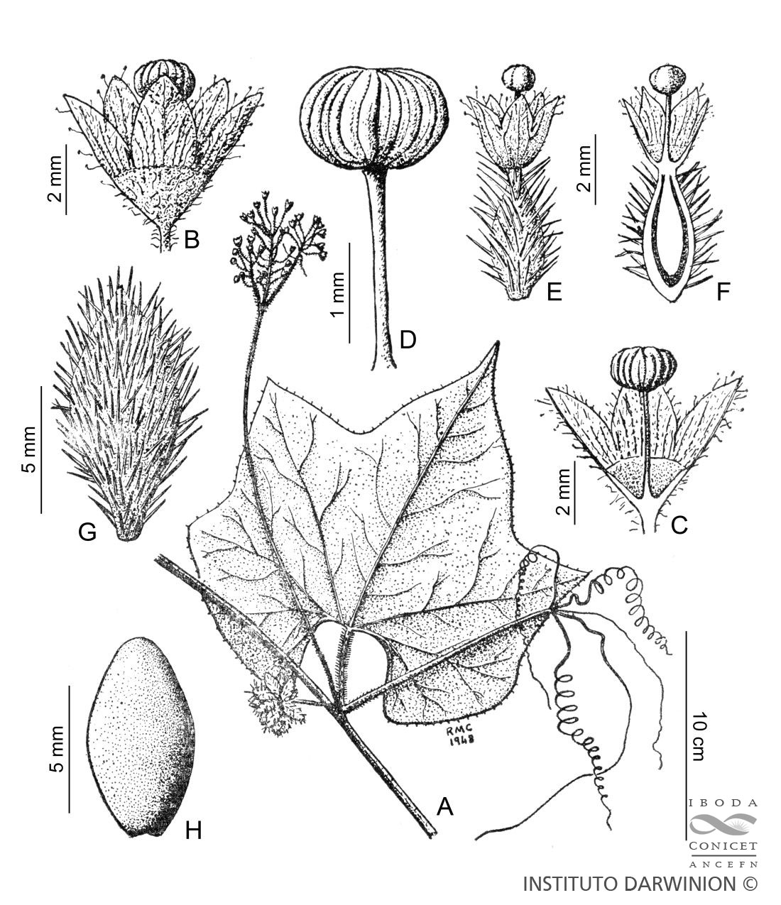 Terófitos zarcillosos con tallos plurimetrales. Hojas con pecíolos de 3-15 cm de largo; láminas 5-anguladas o 5-lobadas, de 9-18 × 9-18 cm, de borde dentado, membranáceas. Zarcillos 5- fidos (4-fidos en el ápice de las ramas). Monocasios estaminados racemiformes, compuestos, de 10-30 cm de largo. Flores estaminadas con hipanto campanulado; sépalos lineares; pétalos de 2-3 × 1,5 mm, verde-blanquecinos; columna filamentaria de 1,5- 2,5 mm de largo; sinantéreo de 1 mm de largo. Flores carpeladas sésiles, dispuestas en glomérulos 10-30-floros; pedúnculos de 1- 3 cm de largo; ovario ovoideo, de 2,5-3,5 mm. Aquenios ovoideos, de 10 × 6 × 3-4 mm, densamente equinados, espinas punzantes, de 2-3 mm de largo, retrorso-pubescentes. Semillas oblongoovoideas, de 8-9 × 5 mm, parduscas, comprimidas.