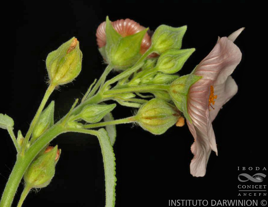 Planta perenne, hemicriptófita, subleñosa, erguida, de 40-80 cm de altura, ramificada con la base, con los tallos rectos, gráciles, sin ramifcar siendo en la parte inferior cilíndricos, estriados y glabros, en la superior poliédricos, canaliculados, densamente pubescentes, con pelitos cortos, cenicientos, simples o estrellados y algunos muy escasos sedosos, rígidos de 2-3 mm de largo. Estipulas de 5-6 mm de largo, aleznadas, densamente pilosas. Hojas con peciolos cilíndricos, canaliculados en la carasuperior, muy pilosos, de 8-15 mm de largo. Lámina alargada, linear-lanceolada, con la base cuneada y el ápice agudo; borde totalmente dentado, con dientes anchos, poco profundos ; 3-5 nervaduras prominentes en la cara inferior y de color obscuro, alto hundidas en la superficie superior. Inflorescencias axilares, aglomeradas en racimos subcorimbosos en la parte superior de las ramas, con pedicelos de 8-15 mm de largo, cilíndricos, tomentosos, articulados de 2-3 min debajo del cáliz, expandiéndose al insertarse con este. Cáliz campanulado-plegado antes de la antesis, con lóbulos, soldados hasta la mitad ; borde y nervaduras prominentes, con la superficie exterior finamente pubescente y el borde con cilias comas; después de la antesis el cáliz se ensancha y al fructificar, ya seco, es apergaminado, amarillo. Pétalos grandes, amarillo-fuerte, asimétricos, netamente bilobados, con un lóbulo mas grande, alargados, de 15-18 mm de largo por 8-10 mm de ancho máximo en el borde ciliado en la base de la uña ; androeceo con tubo de 5 mm de largo, blanquecino, con pelitos brillantes, hialinos. Gineceo con tantas ramas estigmáticas como carpelos tiene el ovario, las que sobresalen encima de los estambres. Ovario esférico, algo aplanado, 10-11-carpelar. Carpelos maduros amarillentos, papiraceos, trígono-aplanados lateralmente, con la parte inferior gruesamente reticulada, semitransparente, dejando ver la semilla rojiza; la parte superior es lisa y con pequeños pelos simples, dehiscentes, con el borde de la dehiscencia cortamente ciliado; la parte superior de los carpelos termina en dos pequeñas aristas oblicuas de 0,5-1 mm de longitud ; los carpelos miden 3.5 mm de altura por 2 mm de profundidad y 1 mm de ancho en el dorso. Semillas castaño-rojizo, glabros, subglobosas, con un grupo de pelitos cortos, blanquecinos, alrededor del hilio. [Hierba perenne, erguida, de 20-50 cm de altura. Estípulas filiformes, de 5 mm de largo. Pecíolo de 10-20 mm de largo. Lámina foliar angosta, oval-lanceolada, 4-6 × 1-2 cm, margen serrado-crenado desde la base, ambas caras completamente cubiertas de pelos estrellados pequeños, más densos y mayores en el envés. Flores solitarias o en glomérulos axilares. Pedicelos de 10-15 mm de largo, articulados hacia el ápice. Cáliz de 6-7 mm de largo, estrelllado-pubescente. Pétalos anaranjados, ca. 10 mm de largo, asimétricos, escotados en el ápice. Ovario 12-carpelar. Mericarpos de 4 × 3 mm, con 2 aristas apicales de 1-2 mm de largo.]