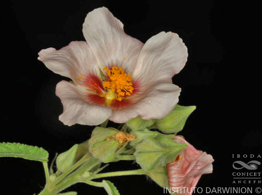 Planta perenne, hemicriptófita, subleñosa, erguida, de 40-80 cm de altura, ramificada con la base, con los tallos rectos, gráciles, sin ramifcar siendo en la parte inferior cilíndricos, estriados y glabros, en la superior poliédricos, canaliculados, densamente pubescentes, con pelitos cortos, cenicientos, simples o estrellados y algunos muy escasos sedosos, rígidos de 2-3 mm de largo. Estipulas de 5-6 mm de largo, aleznadas, densamente pilosas. Hojas con peciolos cilíndricos, canaliculados en la carasuperior, muy pilosos, de 8-15 mm de largo. Lámina alargada, linear-lanceolada, con la base cuneada y el ápice agudo; borde totalmente dentado, con dientes anchos, poco profundos ; 3-5 nervaduras prominentes en la cara inferior y de color obscuro, alto hundidas en la superficie superior. Inflorescencias axilares, aglomeradas en racimos subcorimbosos en la parte superior de las ramas, con pedicelos de 8-15 mm de largo, cilíndricos, tomentosos, articulados de 2-3 min debajo del cáliz, expandiéndose al insertarse con este. Cáliz campanulado-plegado antes de la antesis, con lóbulos, soldados hasta la mitad ; borde y nervaduras prominentes, con la superficie exterior finamente pubescente y el borde con cilias comas; después de la antesis el cáliz se ensancha y al fructificar, ya seco, es apergaminado, amarillo. Pétalos grandes, amarillo-fuerte, asimétricos, netamente bilobados, con un lóbulo mas grande, alargados, de 15-18 mm de largo por 8-10 mm de ancho máximo en el borde ciliado en la base de la uña ; androeceo con tubo de 5 mm de largo, blanquecino, con pelitos brillantes, hialinos. Gineceo con tantas ramas estigmáticas como carpelos tiene el ovario, las que sobresalen encima de los estambres. Ovario esférico, algo aplanado, 10-11-carpelar. Carpelos maduros amarillentos, papiraceos, trígono-aplanados lateralmente, con la parte inferior gruesamente reticulada, semitransparente, dejando ver la semilla rojiza; la parte superior es lisa y con pequeños pelos simples, dehiscentes, con el borde de la dehiscencia cortamente ciliado; la parte superior de los carpelos termina en dos pequeñas aristas oblicuas de 0,5-1 mm de longitud ; los carpelos miden 3.5 mm de altura por 2 mm de profundidad y 1 mm de ancho en el dorso. Semillas castaño-rojizo, glabros, subglobosas, con un grupo de pelitos cortos, blanquecinos, alrededor del hilio. [Hierba perenne, erguida, de 20-50 cm de altura. Estípulas filiformes, de 5 mm de largo. Pecíolo de 10-20 mm de largo. Lámina foliar angosta, oval-lanceolada, 4-6 × 1-2 cm, margen serrado-crenado desde la base, ambas caras completamente cubiertas de pelos estrellados pequeños, más densos y mayores en el envés. Flores solitarias o en glomérulos axilares. Pedicelos de 10-15 mm de largo, articulados hacia el ápice. Cáliz de 6-7 mm de largo, estrelllado-pubescente. Pétalos anaranjados, ca. 10 mm de largo, asimétricos, escotados en el ápice. Ovario 12-carpelar. Mericarpos de 4 × 3 mm, con 2 aristas apicales de 1-2 mm de largo.]