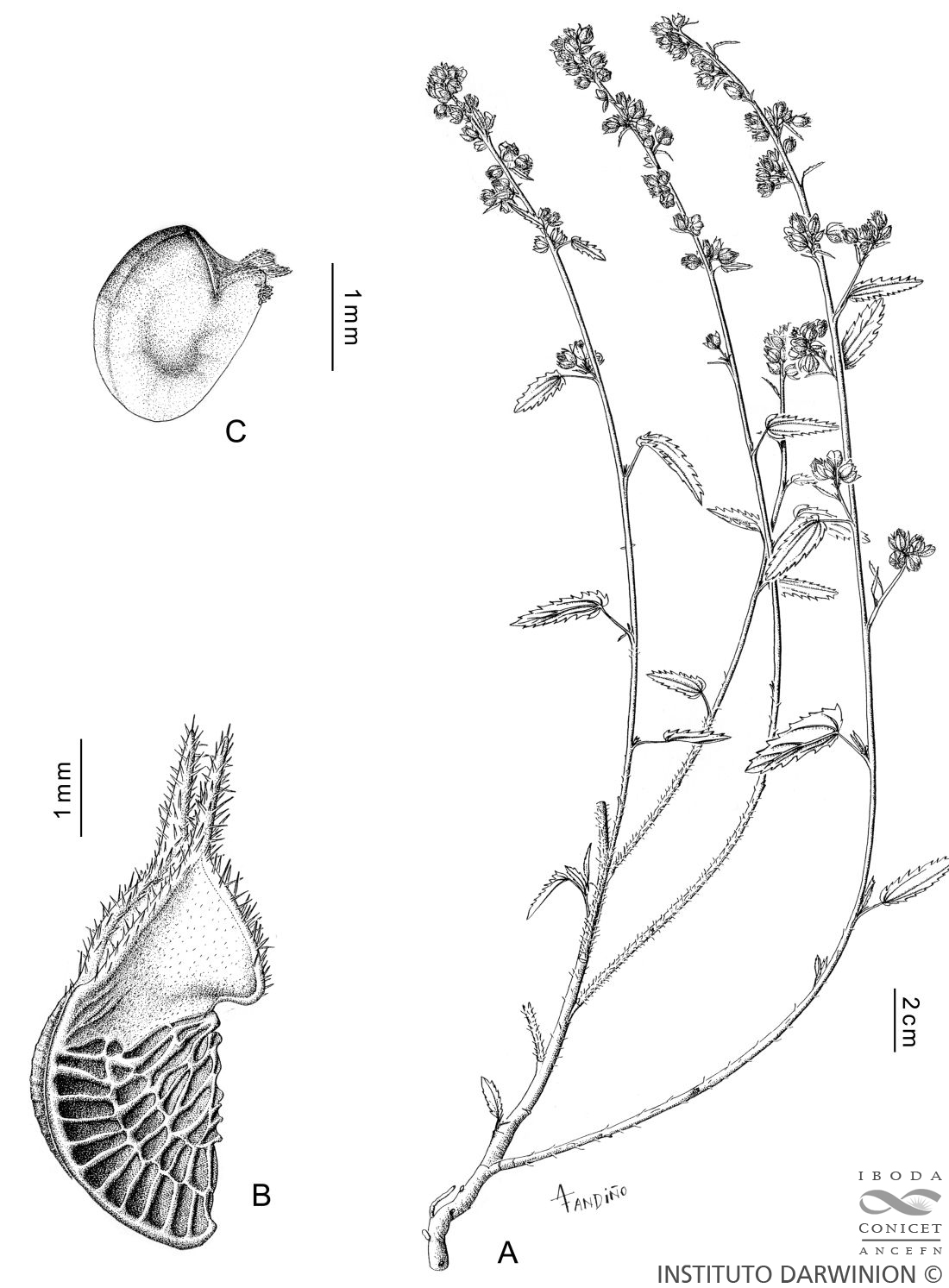 Planta perenne, hemicriptófita, subleñosa, erguida, de 40-80 cm de altura, ramificada con la base, con los tallos rectos, gráciles, sin ramifcar siendo en la parte inferior cilíndricos, estriados y glabros, en la superior poliédricos, canaliculados, densamente pubescentes, con pelitos cortos, cenicientos, simples o estrellados y algunos muy escasos sedosos, rígidos de 2-3 mm de largo. Estipulas de 5-6 mm de largo, aleznadas, densamente pilosas. Hojas con peciolos cilíndricos, canaliculados en la carasuperior, muy pilosos, de 8-15 mm de largo. Lámina alargada, linear-lanceolada, con la base cuneada y el ápice agudo; borde totalmente dentado, con dientes anchos, poco profundos ; 3-5 nervaduras prominentes en la cara inferior y de color obscuro, alto hundidas en la superficie superior. Inflorescencias axilares, aglomeradas en racimos subcorimbosos en la parte superior de las ramas, con pedicelos de 8-15 mm de largo, cilíndricos, tomentosos, articulados de 2-3 min debajo del cáliz, expandiéndose al insertarse con este. Cáliz campanulado-plegado antes de la antesis, con lóbulos, soldados hasta la mitad ; borde y nervaduras prominentes, con la superficie exterior finamente pubescente y el borde con cilias comas; después de la antesis el cáliz se ensancha y al fructificar, ya seco, es apergaminado, amarillo. Pétalos grandes, amarillo-fuerte, asimétricos, netamente bilobados, con un lóbulo mas grande, alargados, de 15-18 mm de largo por 8-10 mm de ancho máximo en el borde ciliado en la base de la uña ; androeceo con tubo de 5 mm de largo, blanquecino, con pelitos brillantes, hialinos. Gineceo con tantas ramas estigmáticas como carpelos tiene el ovario, las que sobresalen encima de los estambres. Ovario esférico, algo aplanado, 10-11-carpelar. Carpelos maduros amarillentos, papiraceos, trígono-aplanados lateralmente, con la parte inferior gruesamente reticulada, semitransparente, dejando ver la semilla rojiza; la parte superior es lisa y con pequeños pelos simples, dehiscentes, con el borde de la dehiscencia cortamente ciliado; la parte superior de los carpelos termina en dos pequeñas aristas oblicuas de 0,5-1 mm de longitud ; los carpelos miden 3.5 mm de altura por 2 mm de profundidad y 1 mm de ancho en el dorso. Semillas castaño-rojizo, glabros, subglobosas, con un grupo de pelitos cortos, blanquecinos, alrededor del hilio. [Hierba perenne, erguida, de 20-50 cm de altura. Estípulas filiformes, de 5 mm de largo. Pecíolo de 10-20 mm de largo. Lámina foliar angosta, oval-lanceolada, 4-6 × 1-2 cm, margen serrado-crenado desde la base, ambas caras completamente cubiertas de pelos estrellados pequeños, más densos y mayores en el envés. Flores solitarias o en glomérulos axilares. Pedicelos de 10-15 mm de largo, articulados hacia el ápice. Cáliz de 6-7 mm de largo, estrelllado-pubescente. Pétalos anaranjados, ca. 10 mm de largo, asimétricos, escotados en el ápice. Ovario 12-carpelar. Mericarpos de 4 × 3 mm, con 2 aristas apicales de 1-2 mm de largo.]