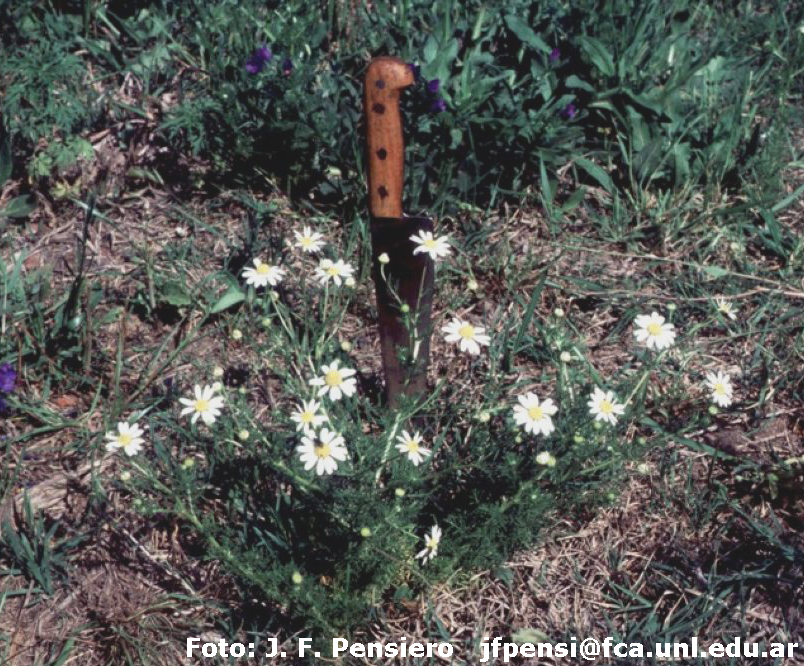 Hierbas anuales, aromáticas, escasamente pubescentes, ramosas desde abajo, de 15-50 cm de alto, fétidas. Hojas de contorno obovado, de 15-60 × 5-30 mm, 2-3-pinnatisectas, lóbulos linear-lanceolados, mucronados (raquis y segmentos angostos). Capítulos radiados sobre pedúnculos delgados. Involucro de 2-3 × 5-9 mm; filarios 3-seriados, ovado-lanceolados, laxamente pubescentes, margen escarioso y nervadura central obscura. Receptáculo cónico con páleas linear-subuladas sólo en las flores internas. Flores dimorfas: las del margen neutras, lígulas blancas, de 5-15 × 3-6 mm, tubos breves, alados; flores del centro perfectas, corolas tubulosas, de 2-2,5 mm de largo, amarillas. Aquenios obovoides o turbinados, oscuros, de 1-2,5 mm de largo, con 8-10 costillas granuloso-tuberculadas. Papus ausente.