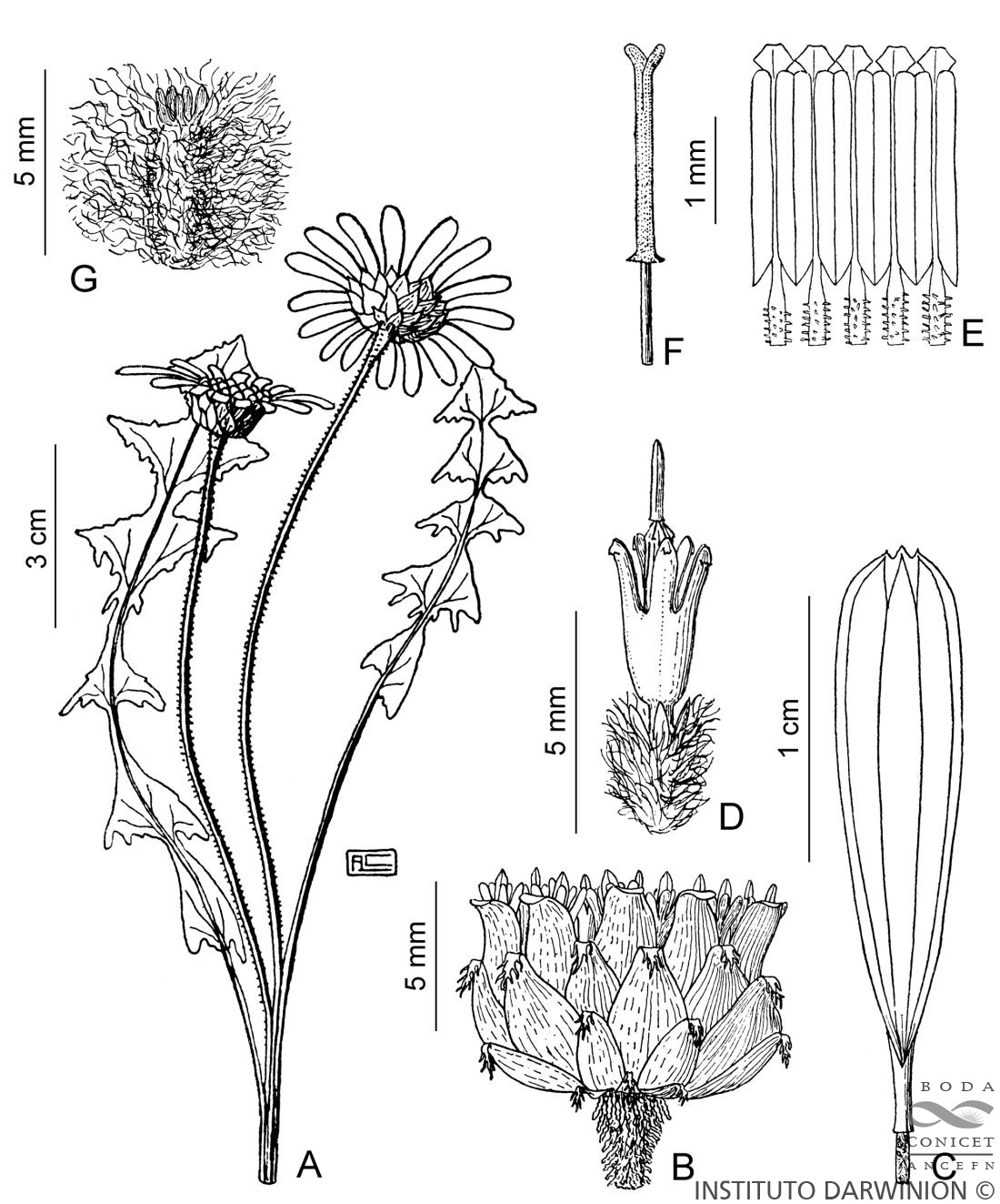 A. Parte superior de la planta. B. Capitulo. C. Flor del margen. D. Flor del centro. E. Estambres. F. Parte superior del estilo. G. Aquenio con papus.