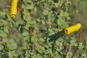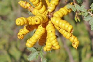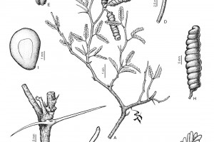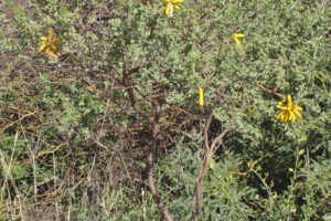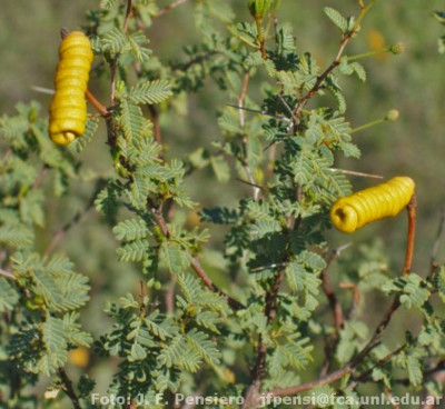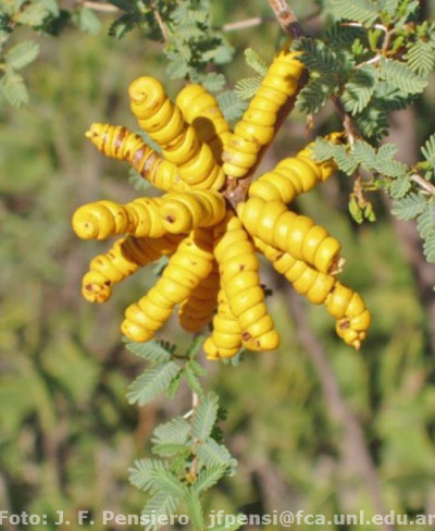Arbusto bajo no mayor de 1 m de alt., espinoso con órganos subterráneos invasores. Hojas de 0,4-1,1 cm incluyendo al pecíolo; uniyugadas de 5-10-yugos, folíolos de 1,3- 2,8 x 0,6-0,8 mm, pubescentes, alternos aproximados unos a otros, generalmente imbricados. Legumbres amarillas, opacas, densamente espiraladas, de casi 5 cm x 7 mm de diámetro.