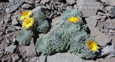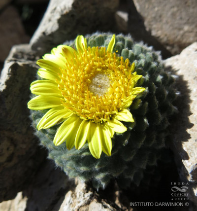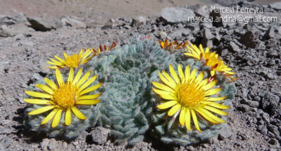 Hierbas perennes, bajas, de 5-8 cm de alto, densamente lanosas, con rizoma largo, grueso, ramificado, monoicas; tallos cortos, simples o apenas ramificados, delgados, densamente hojosos, especialmente en la base de los capítulos. Hojas inferiores lineares, de 4-6 × 2 mm, obtusas en el ápice, las superiores atenuadas en la base en pseudopecíolo linear, de 12- 14 × 6-7 mm y dilatadas en la porción superior en una lámina espatulada, de 4-6 × 6-7 mm, truncadas en el ápice, con márgenes engrosados, densamente seríceo-lanosas en ambas caras. Capítulos heterógamos, radiados, sésiles, solitarios en el ápice de los tallos, rodeados por algunas hojas. Involucro hemisférico, de 20-25 × 25-30 mm; filarios 2-3-seriados, los externos lineares, espatulados en la parte superior, de 20 × 1 mm (en la parte media), con bordes membranáceos hacia la base y ápice agudo, lanosos, los internos lanceolados, de 21-22 × 3 mm, largamente acuminados y lanosos en el ápice, con bordes membranáceos. Flores dimorfas, las del margen 20-30, pistiladas, con corola amarilla y rojiza en el dorso, bilabiada, con tubo de 6 mm de largo, labio exterior liguliforme, de 13-14 × 2 mm, labio interior 2-fido, muy corto, las del centro 50-70, perfectas, con corola amarilla, bilabiada, tubo de 10 mm de largo y labios de 2 mm de largo, el exterior 3- dentado y el interior 2-fido; ramas del estilo de 0,3 mm de largo. Aquenios cilindroides, de 8-9 mm de largo, glabros a veces espaciadamente pilosos, con cortos pelos dobles. Papus de 11- 13 mm de largo, blanco.