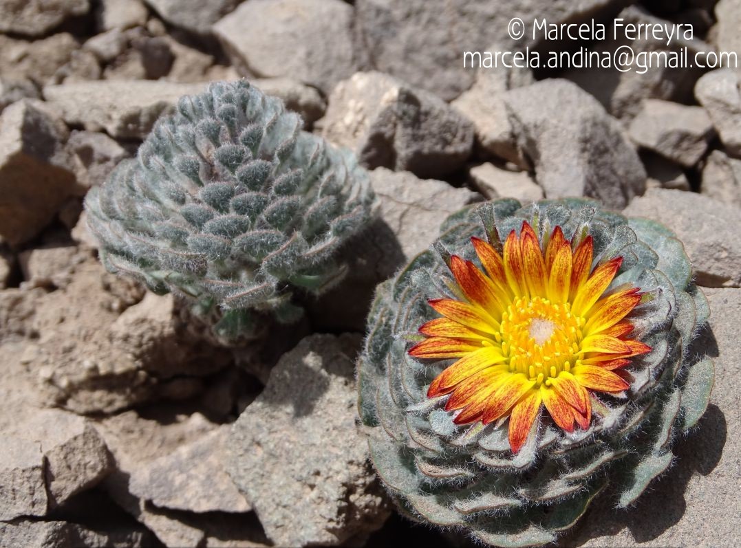 Hierbas perennes, bajas, de 5-8 cm de alto, densamente lanosas, con rizoma largo, grueso, ramificado, monoicas; tallos cortos, simples o apenas ramificados, delgados, densamente hojosos, especialmente en la base de los capítulos. Hojas inferiores lineares, de 4-6 × 2 mm, obtusas en el ápice, las superiores atenuadas en la base en pseudopecíolo linear, de 12- 14 × 6-7 mm y dilatadas en la porción superior en una lámina espatulada, de 4-6 × 6-7 mm, truncadas en el ápice, con márgenes engrosados, densamente seríceo-lanosas en ambas caras. Capítulos heterógamos, radiados, sésiles, solitarios en el ápice de los tallos, rodeados por algunas hojas. Involucro hemisférico, de 20-25 × 25-30 mm; filarios 2-3-seriados, los externos lineares, espatulados en la parte superior, de 20 × 1 mm (en la parte media), con bordes membranáceos hacia la base y ápice agudo, lanosos, los internos lanceolados, de 21-22 × 3 mm, largamente acuminados y lanosos en el ápice, con bordes membranáceos. Flores dimorfas, las del margen 20-30, pistiladas, con corola amarilla y rojiza en el dorso, bilabiada, con tubo de 6 mm de largo, labio exterior liguliforme, de 13-14 × 2 mm, labio interior 2-fido, muy corto, las del centro 50-70, perfectas, con corola amarilla, bilabiada, tubo de 10 mm de largo y labios de 2 mm de largo, el exterior 3- dentado y el interior 2-fido; ramas del estilo de 0,3 mm de largo. Aquenios cilindroides, de 8-9 mm de largo, glabros a veces espaciadamente pilosos, con cortos pelos dobles. Papus de 11- 13 mm de largo, blanco.