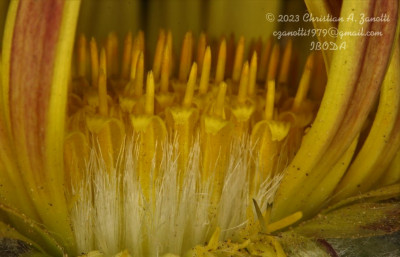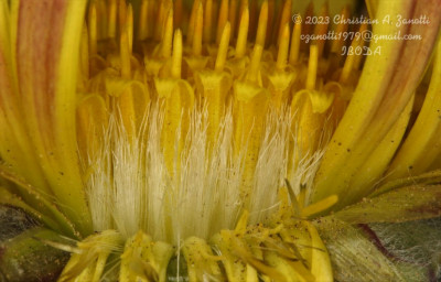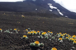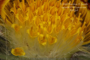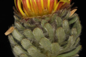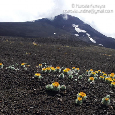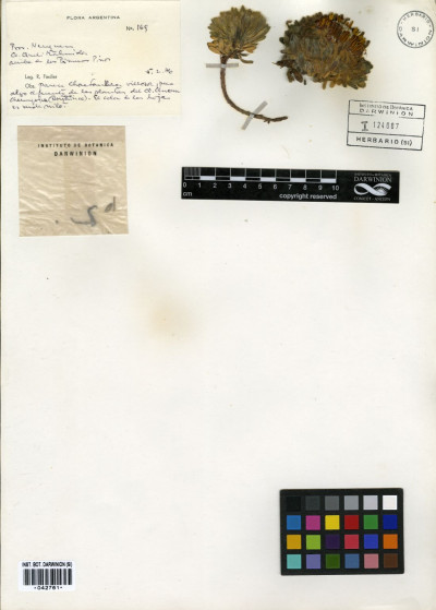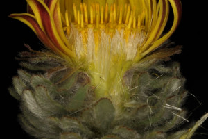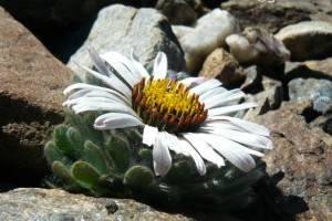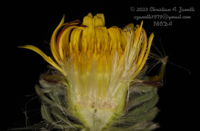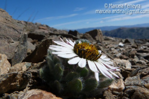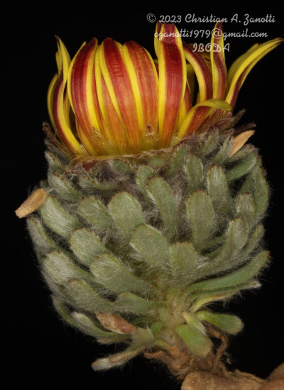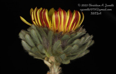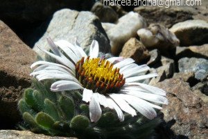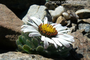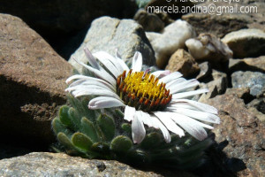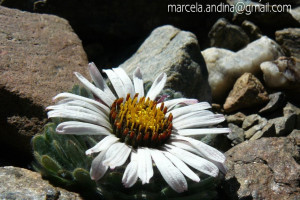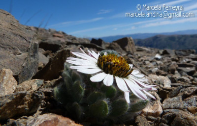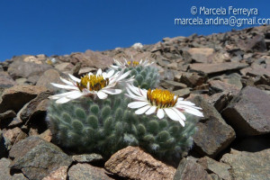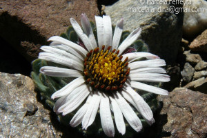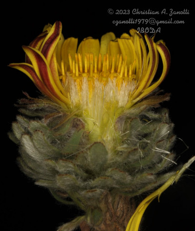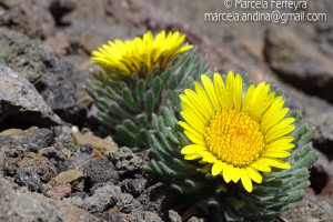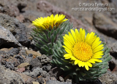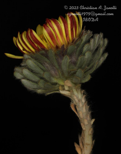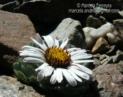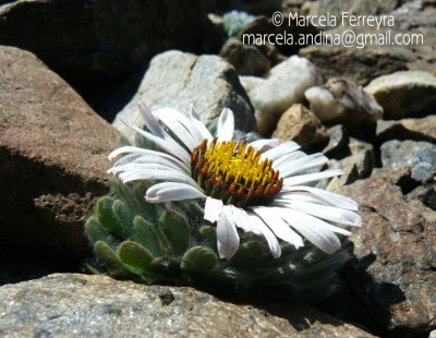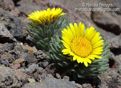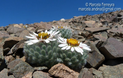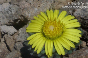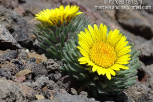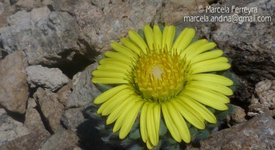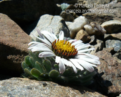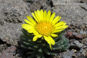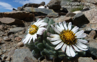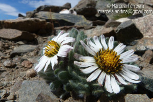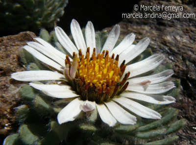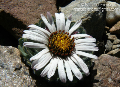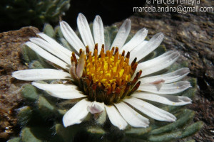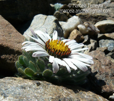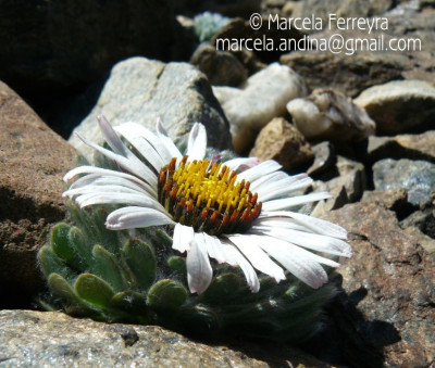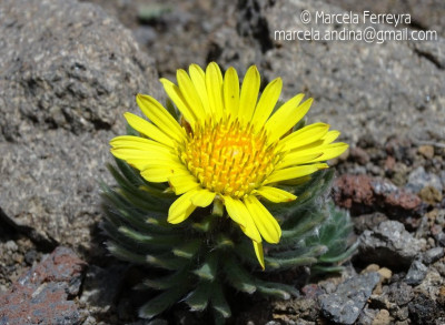 Hierbas perennes, bajas, de 5-7 cm de alto, densamente seríceovelludas, con rizoma largo, monoicas; tallos muy cortos o casi nulos, densamente hojosos especialmente en la base de los capítulos. Hojas oblanceolado-espatuladas, de 13-22 × 3-4 mm, atenuadas en la base, obtusas y con 3-5 dientes en el ápice, densamente seríceolanosas en ambas caras. Capítulos heterógamos, radiados, sésiles, solitarios en el ápice de los tallos, rodeados por algunas hojas. Involucro hemisférico, de 20-25 × 25-30 mm; filarios 2-3-seriados, los externos lineares en la parte superior, de 19-20 × 1 mm (en la parte media), con bordes membranáceos en la base y ápice agudo, densamente seríceo-pubescentes, los internos lanceolados, de 23- 27 × 3-4 mm, agudos en el ápice, con bordes membranáceos, laxamente seríceos. Flores dimorfas, las del margen 20-35, pistiladas, con corola amarilla, bilabiada, tubo de 8-10 mm de largo, labio exterior liguliforme, de 14-15 × 2-3 mm, labio interior 2-fido, de 2-3,5 mm de largo, las del centro ca. 50, perfectas, con corola amarilla, bilabiada, tubo de 12-15 mm de largo y labios de 3 mm de largo, el exterior 3- dentado y el interior 2-fido; ramas del estilo de 0,5 mm de largo. Aquenios cilindroides, de 8 mm de largo, glabros a veces espaciadamente pilosos, con pelos dobles, globosos. Papus de 13-15 mm de largo, blanco.
