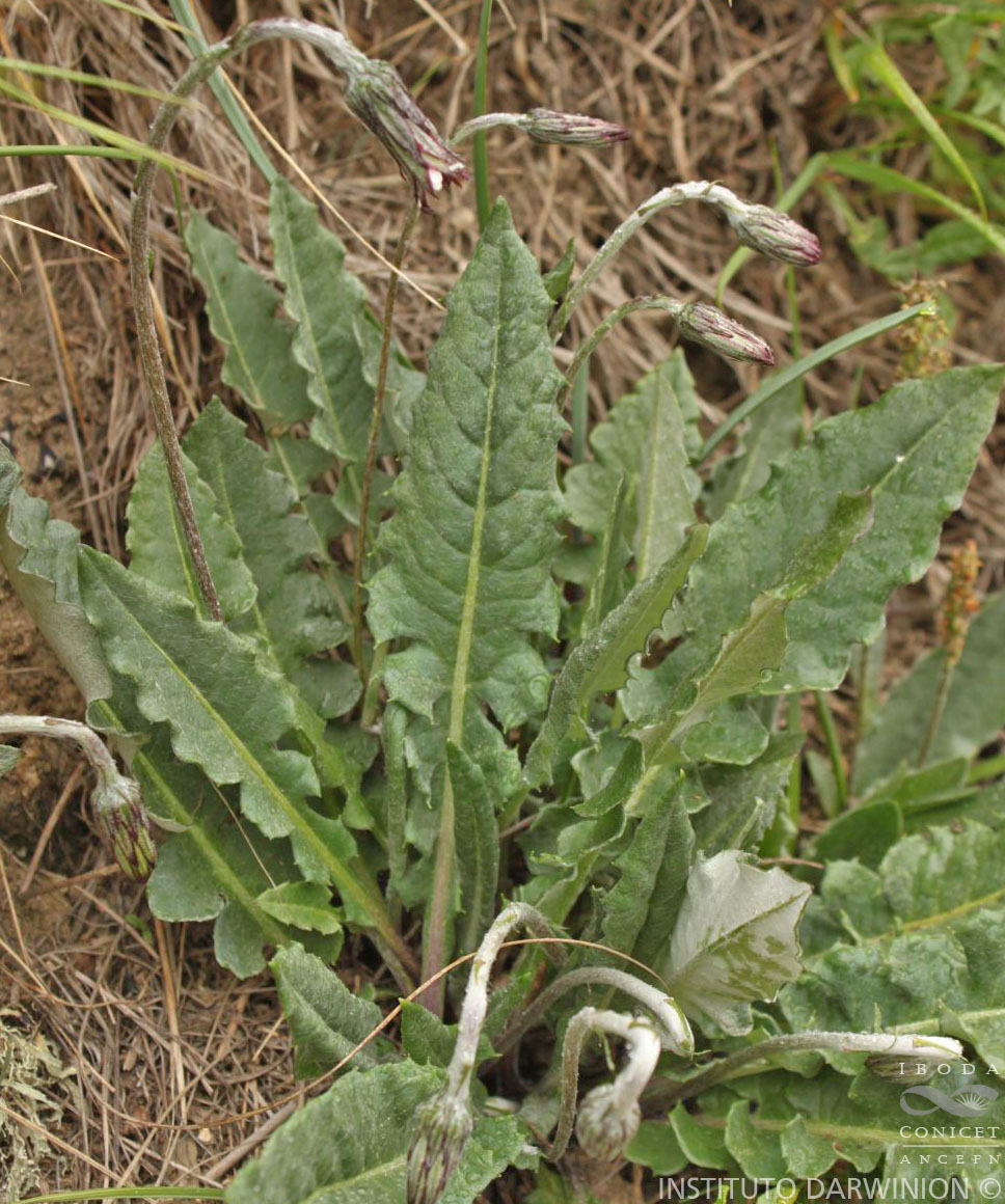 Hierbas perennes, con rizoma breve y raíces adventicias delgadas. Hojas en roseta, lirado-pinnatífidas, de 3-17 × 0,7-3 cm, atenuadas en la base en un pseudopecíolo plano de 1-3 cm de ancho, con lóbulo terminal grande, ovado, crenado-denticulado en el margen, agudo en el ápice y 3-5 pares de lóbulos laterales, gradualmente menores, denticulados; herbáceas, discoloras, glabrescentes o lanuginosas en la cara superior y blancotomentosas en la inferior. Capítulos solitarios, usualmente nutantes, a veces erectos, en el extremo de un escapo floral de 3- 20 cm de largo, tomentoso, con 2-8 brácteas subuladas. Involucro cilíndrico-acampanado, de 11-15 × 8 mm; filarios pluriseriados, tomentosos en el dorso. Flores 25-40, trimorfas, con corolas rosadas, las del margen 1-seriadas, pistiladas, con corolas subliguladas, de 8-10 mm de largo, las siguientes numerosas, pistiladas, con corolas filiforme-bilabiadas, de 4-7 mm de largo y estilo apenas más largo que la corola, las del centro perfectas, con corolas tubuloso-bilabiadas, de 7-9 mm de largo. Aquenios fusiformes, de 7-10 mm de largo, 5-7-costados, rostro más corto que la parte seminífera, de 1,5-3 mm de largo, cortamente pubescentes. Papus blanco, de 8-10 mm de largo.