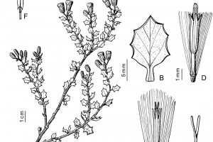 Arbustitos dioicos, de 20-50 cm de alto; ramas erectas, hojosas en la parte superior. Hojas dispuestas densamente, cortamente pecioladas; pecíolos de 1-4 mm de largo; láminas ovadas u orbiculares, de (3-)5-14(-16) × 4-8 mm, redondeadas en la base, revolutas en el margen y con 2-3(-4) dientes a cada lado. Capítulos 1-3, subsésiles, sobre ramas laterales cortas. Involucro de 5-6 × 4 mm, ligeramente más corto que las flores, apenas caliculado con 1-2 bractéolas lineares; filarios 8-10, oblongos, agudos o subobtusos, tomentosos en el dorso, hialinos en los márgenes. Capítulos estaminados: flores isomorfas 15-20, corolas amarillentas o violáceas, tubulosas, de 5,5-6 mm de largo, 5- lobadas, lóbulos de 0,7 mm de largo; ovario estéril. Capítulos pistilados: flores isomorfas 15-20, corolas estrechamente tubulosas, ca. 6 mm de largo, lóbulos de la corola de 1 mm de largo; anteras rudimentarias. Aquenios cilíndricos, de 3 mm de largo, costados, glabros. Papus de 6-8 mm de largo, rojizo o violáceo.