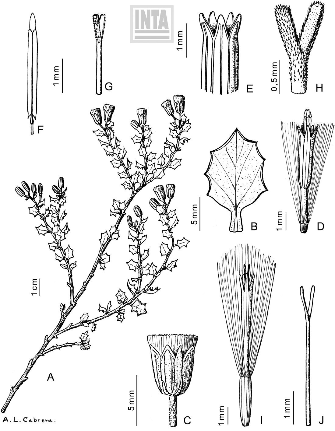A. Rama florífera. B. Hoja. C. Capítulo. D. Flor perfecta (funcionalmente estaminada). E. Ápice de la corola de una flor estaminada. F. Estambre. G. Porción superior del estilo de una flor estaminada. H. Detalle del ápice del estilo de una flor estaminada. I. Flor pistilada. J. Porción superior del estilo de una flor pistilada.