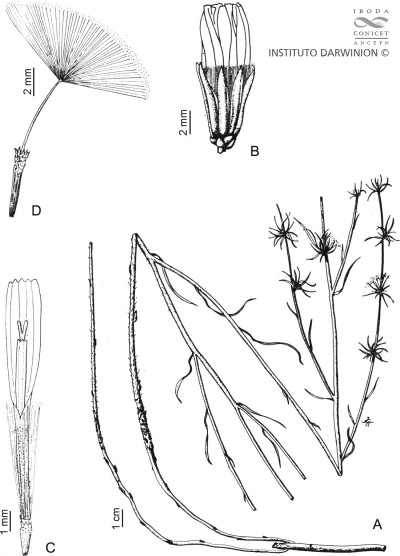 Hierbas perennes, de 30-130 cm de alto; tallos ramosos, estriados, híspidos en la parte inferior, con rizomas y raíces gemíferas. Hojas basales pecioladas, linear-lanceoladas u oblongolanceoladas, de 5-13 cm × 1,5-3,5 mm, sinuadas, dentadas o runcinadas, glaucas. Hojas caulinares alternas, sésiles, lanceoladas o lineares, de 1-7 cm × 1-5 mm, dentadas o enteras, menores hacia el ápice. Capítulos sésiles o pedunculados, axilares, solitarios o pocos agrupados. Involucro cilíndrico, de 9-12 × 3-4 mm; filarios 8-10 en una serie, linear-lanceolados, agudos, margen escarioso, tomentosos, acompañados por bractéolas escamiformes, tomentosas. Flores 7-12 con corolas amarillas, raro violáceas o blanquecinas, de 10-15 mm de largo. Aquenios rostrados, de 7-10 mm de largo. Papus blanco, de 5-8 mm de largo.