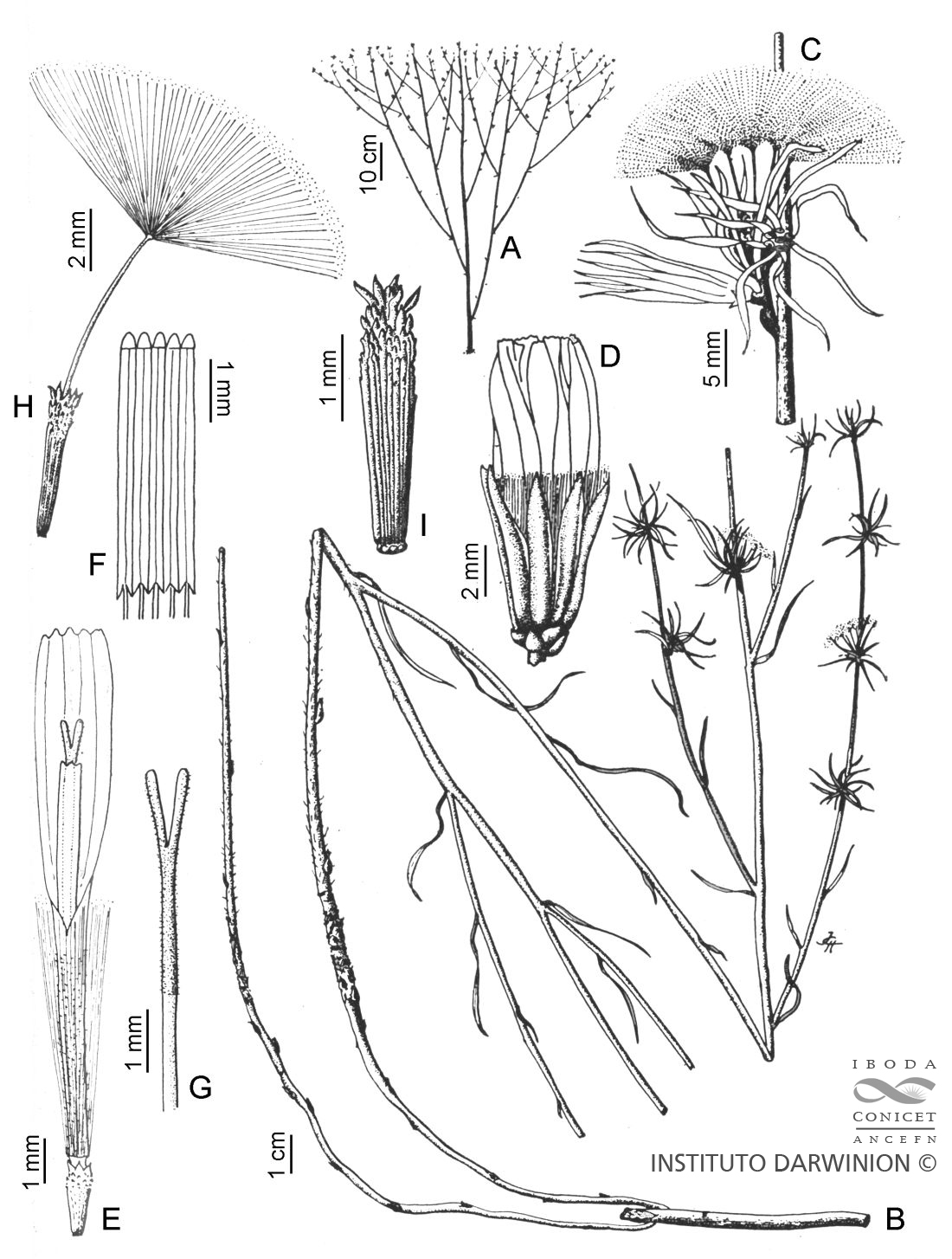 Hierbas perennes, de 30-130 cm de alto; tallos ramosos, estriados, híspidos en la parte inferior, con rizomas y raíces gemíferas. Hojas basales pecioladas, linear-lanceoladas u oblongolanceoladas, de 5-13 cm × 1,5-3,5 mm, sinuadas, dentadas o runcinadas, glaucas. Hojas caulinares alternas, sésiles, lanceoladas o lineares, de 1-7 cm × 1-5 mm, dentadas o enteras, menores hacia el ápice. Capítulos sésiles o pedunculados, axilares, solitarios o pocos agrupados. Involucro cilíndrico, de 9-12 × 3-4 mm; filarios 8-10 en una serie, linear-lanceolados, agudos, margen escarioso, tomentosos, acompañados por bractéolas escamiformes, tomentosas. Flores 7-12 con corolas amarillas, raro violáceas o blanquecinas, de 10-15 mm de largo. Aquenios rostrados, de 7-10 mm de largo. Papus blanco, de 5-8 mm de largo.